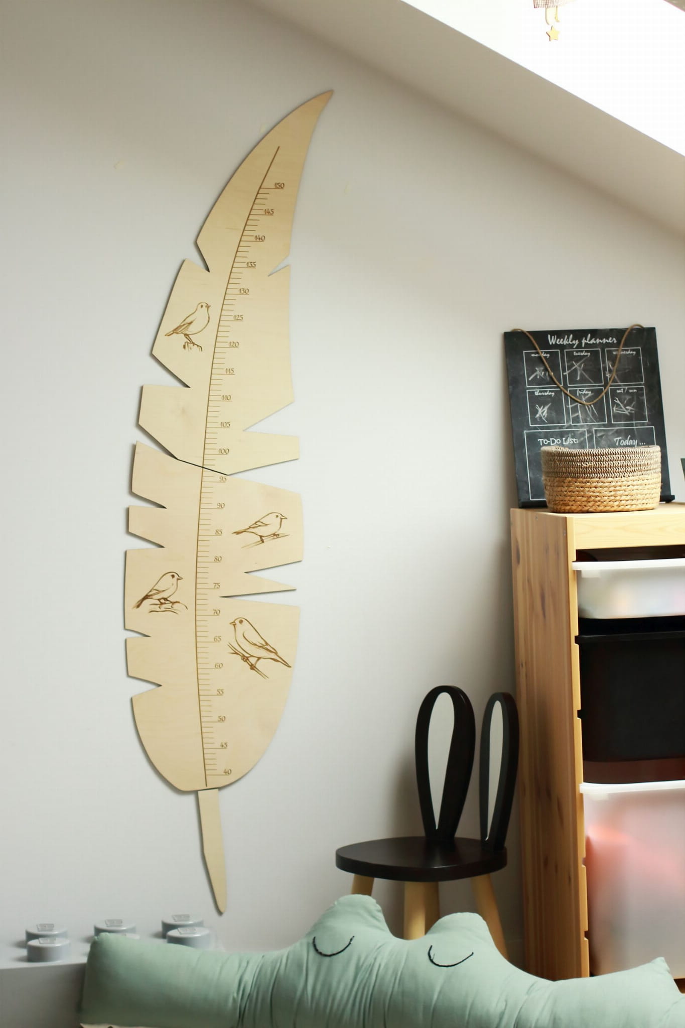 A height measure, which is also a great decoration! A beautifully made feather will look beautiful in natural interiors. It will work perfectly in rooms with a forest motif. Wood matches other accessories and decorations, so you can easily match such a measure of plywood to furniture, wallpaper or stickers in any color.