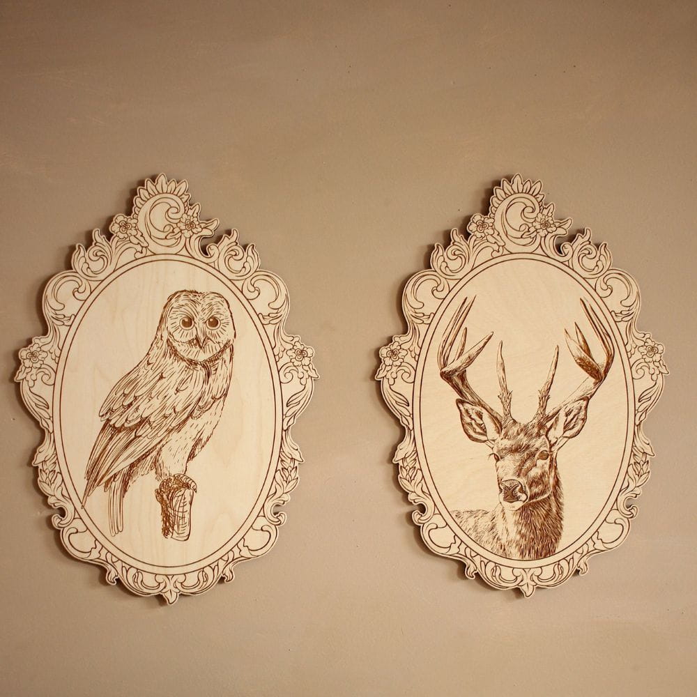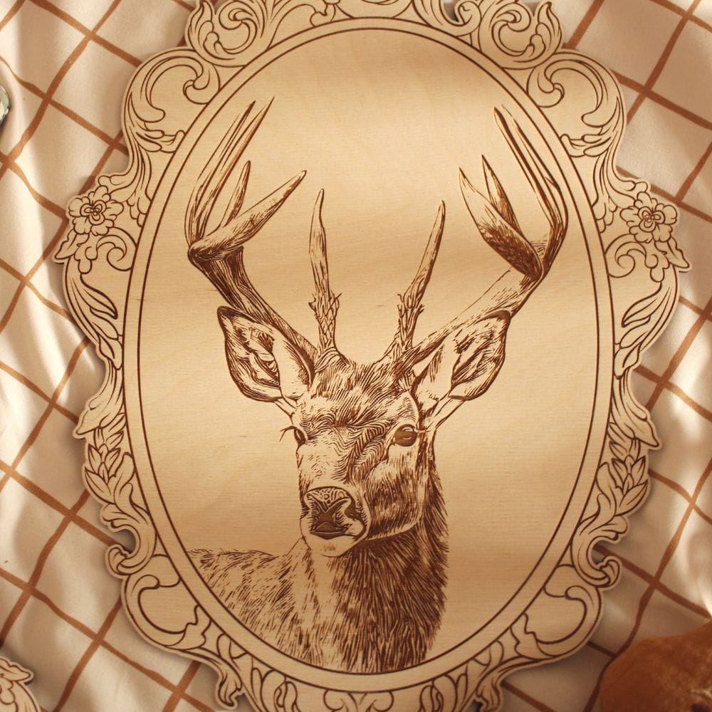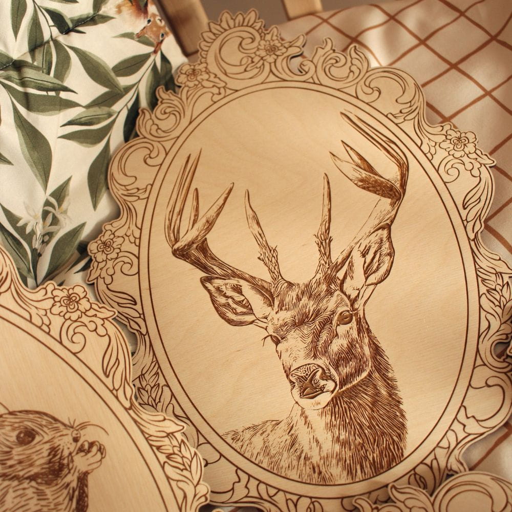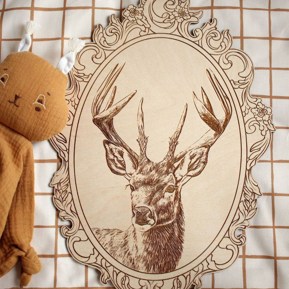 Imagine a room adorned with a delicate yet graceful motif. Check out this lovely picture featuring an engraved deer in a retro frame. This decoration perfectly blends vintage style with the charm of nature, making it a wonderful addition to woodland-themed nurseries.