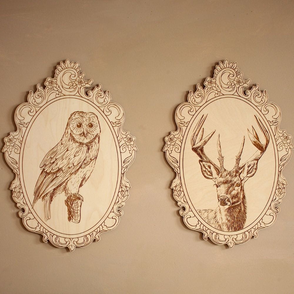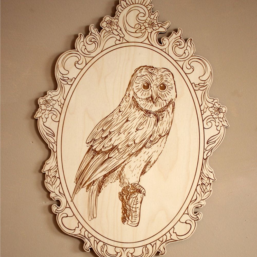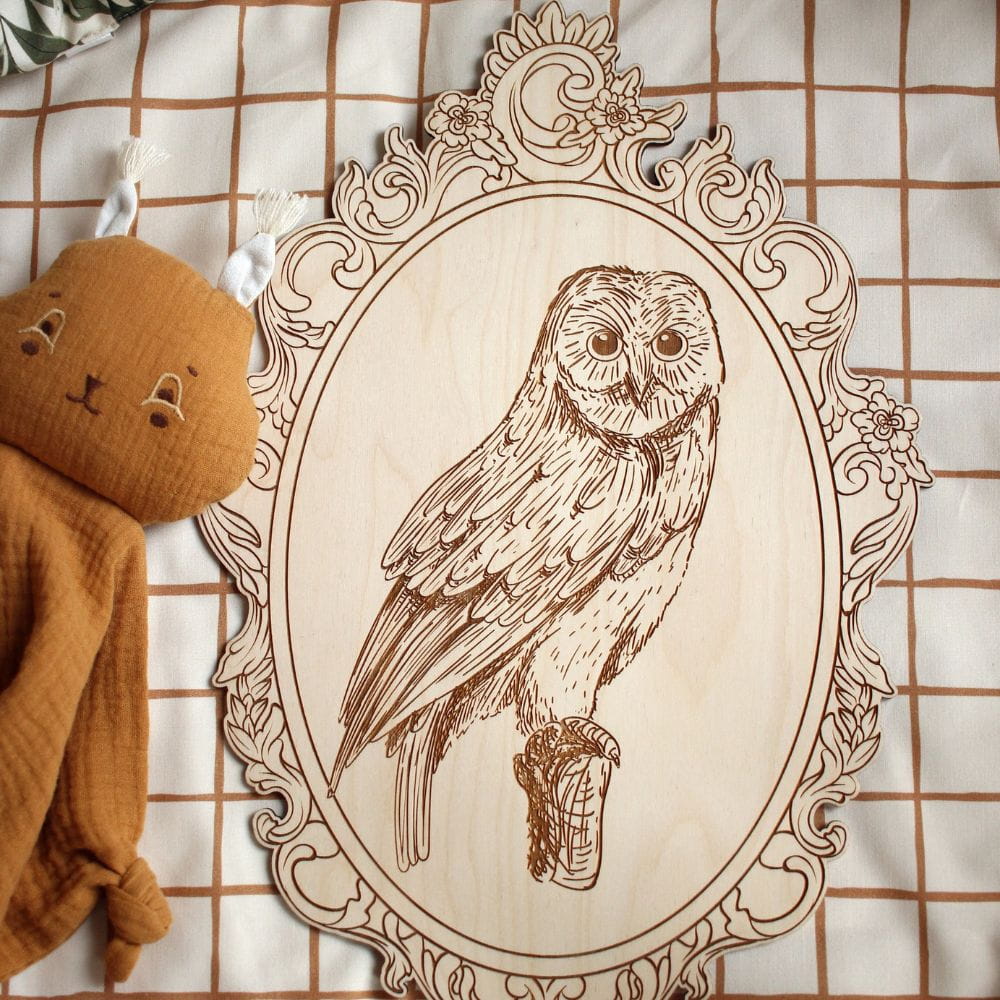 Imagine a room adorned with a delicate yet graceful motif. Check out this lovely picture featuring an engraved owl in a retro frame. This decoration perfectly blends vintage style with the charm of nature, making it a wonderful addition to woodland-themed nurseries.