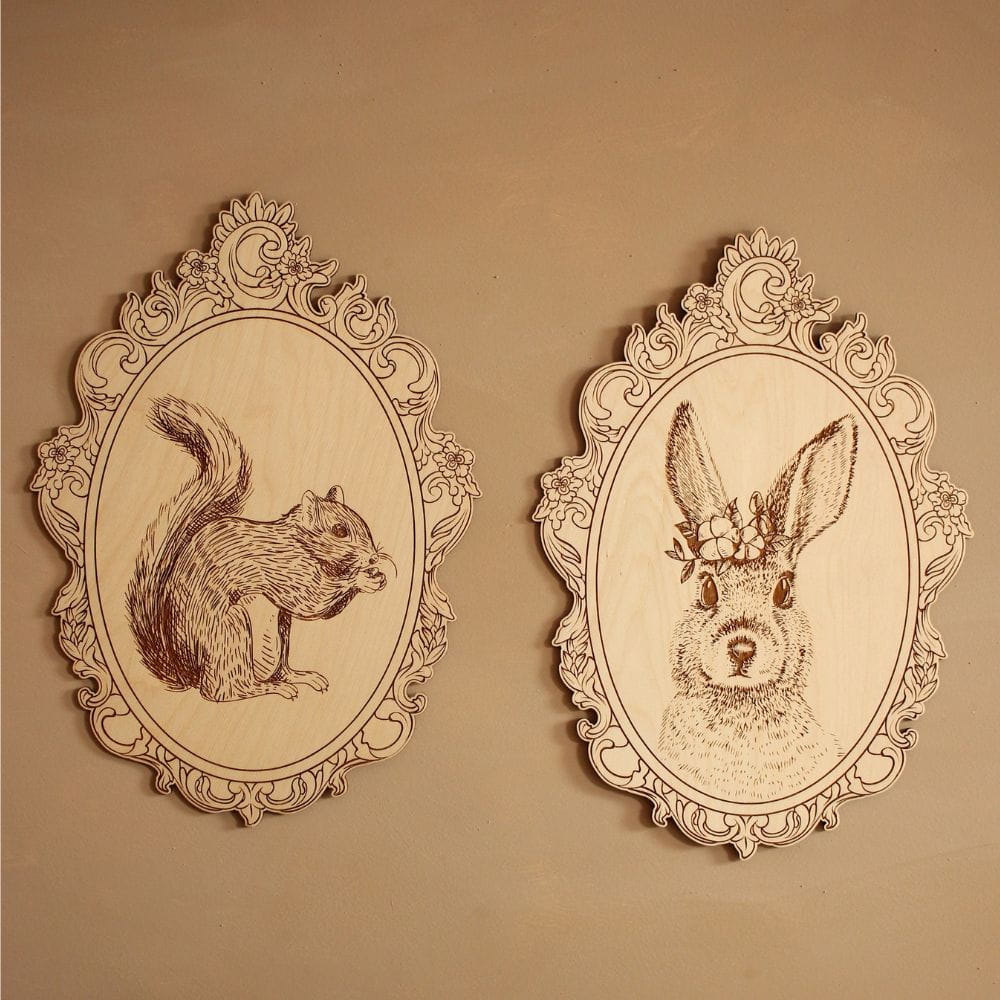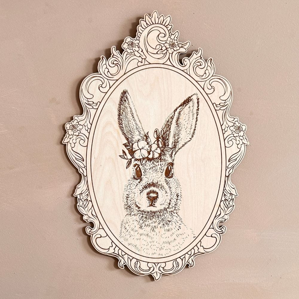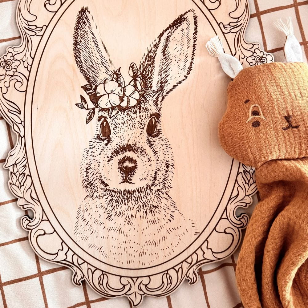 Imagine a room adorned with a delicate yet graceful motif. Check out this lovely picture featuring an engraved rabbit in a retro frame. This decoration perfectly blends vintage style with the charm of nature, making it a wonderful addition to woodland-themed nurseries.