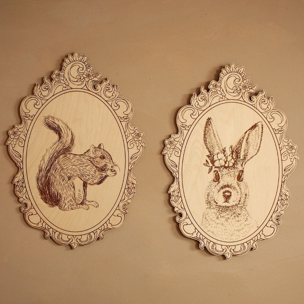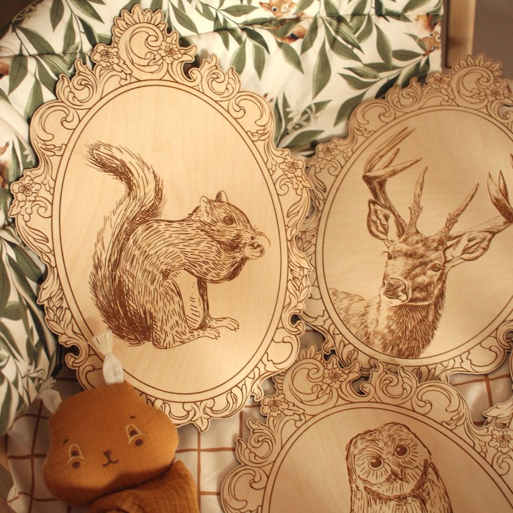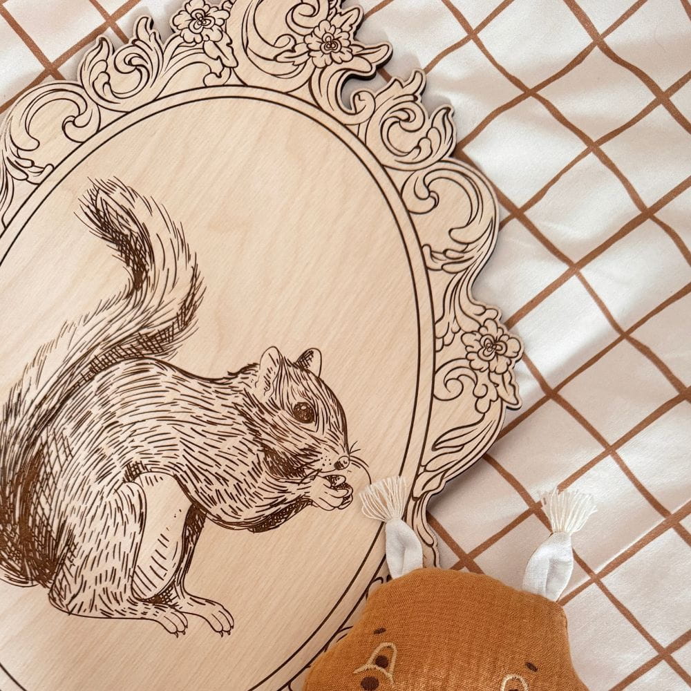 Imagine a room adorned with a delicate yet graceful motif. Check out this lovely picture featuring an engraved squirrel in a retro frame. This decoration perfectly blends vintage style with the charm of nature, making it a wonderful addition to woodland-themed nurseries.
