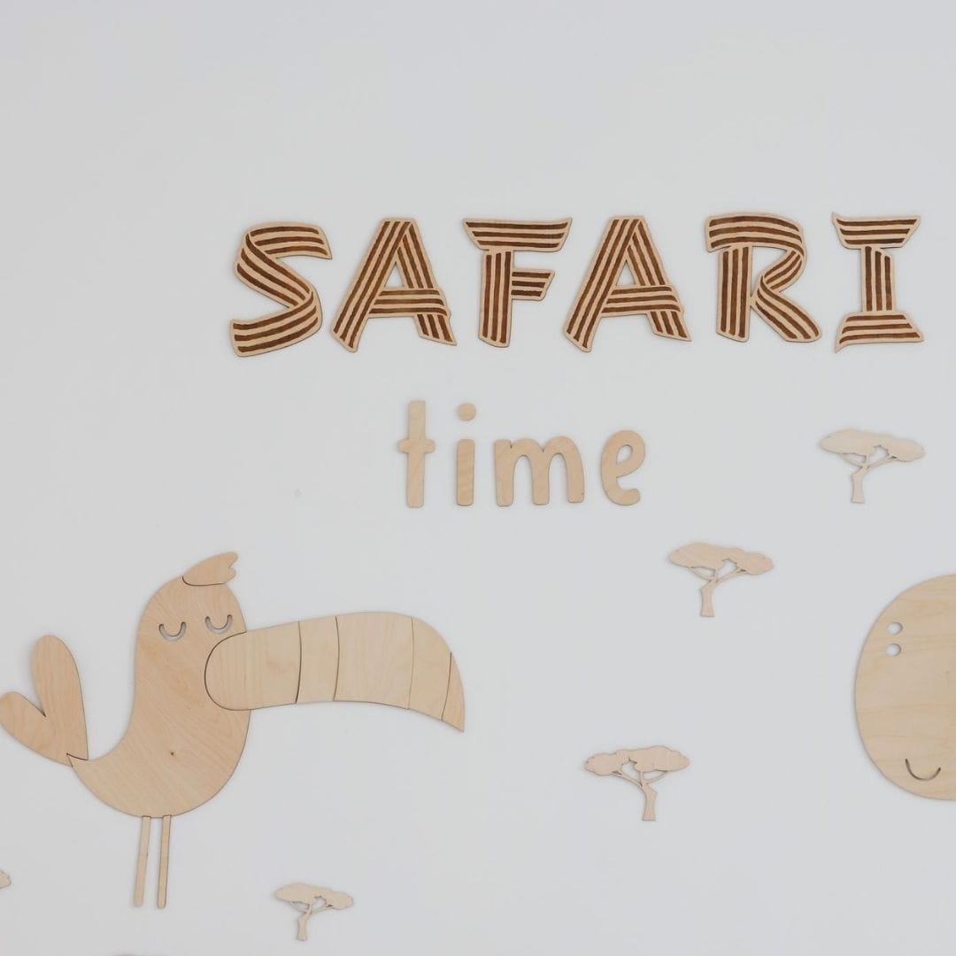 Wooden inscription for children's rooms in the safari style. It perfectly complements the collection of wooden jungle animals.