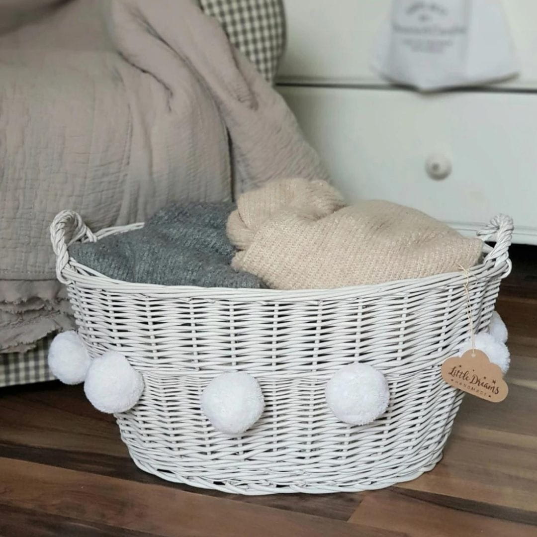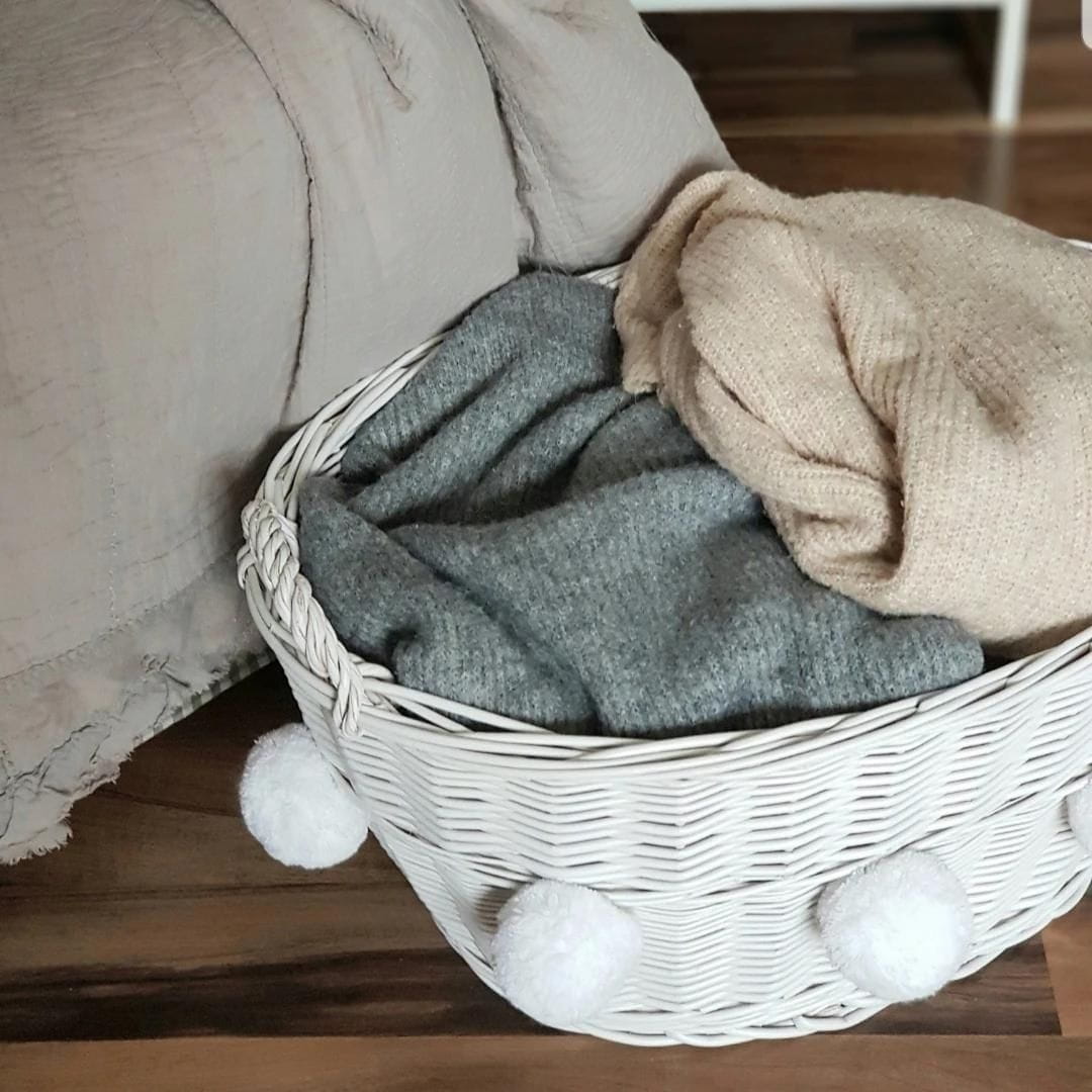 The charming round basket will be perfect for storing toys and other treasures, and it will look beautiful in any interior. There are pompoms attached to the basket, which can be untied and attached elsewhere.