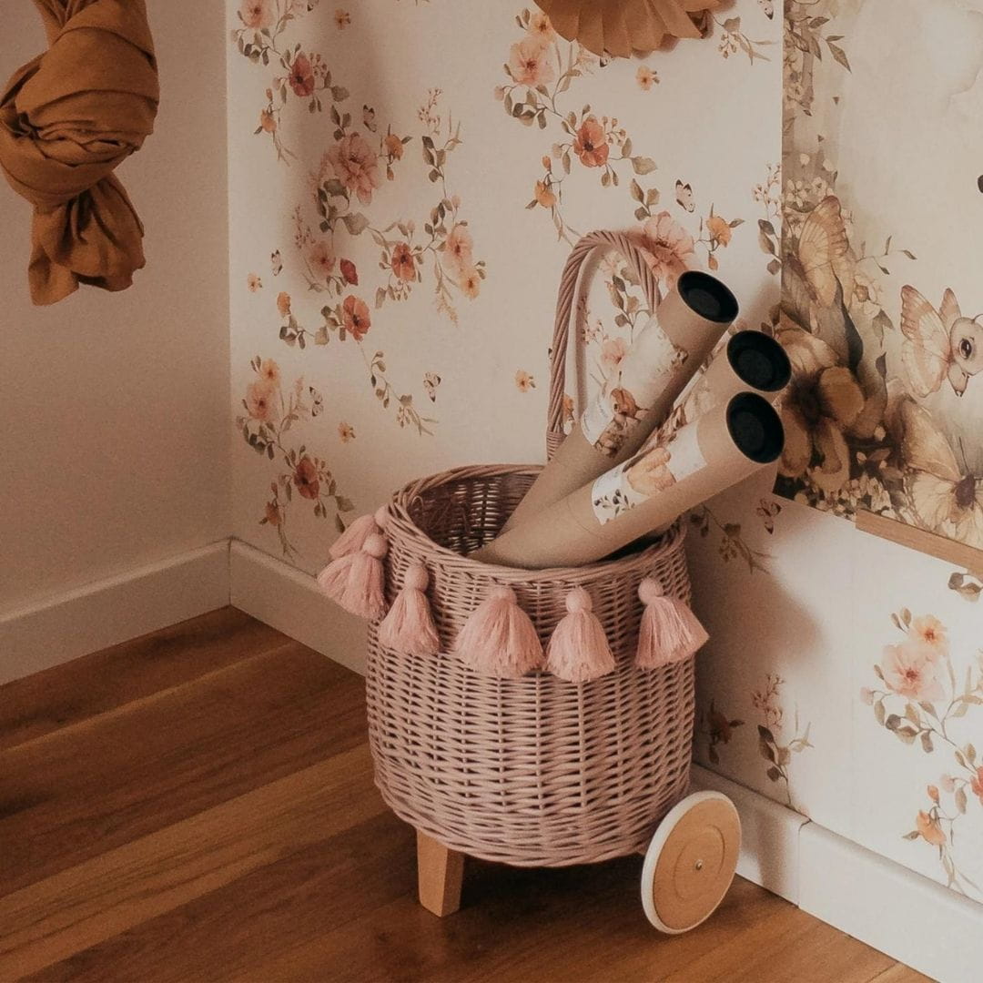 A beautiful basket on wheels for dolls, teddy bears. Perfect for storing and transporting children's treasures, and it will look beautiful in any interior. Such a wicker basket is great fun for every little lady, and at the same time a 100% stylish, ecological and Polish toy. It will be a perfect gift for a child.