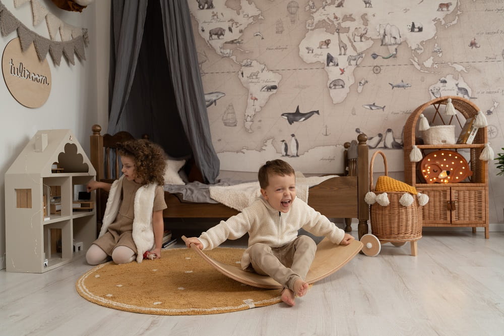It will create a natural atmosphere in a child's interior, but also has a practical application - it can act as a bookcase, the shelves will fit your favorite toys or school supplies. The bottom shelf has an opening door with leather handles. There are five tassels attached to the shelf that can be untied and attached elsewhere.