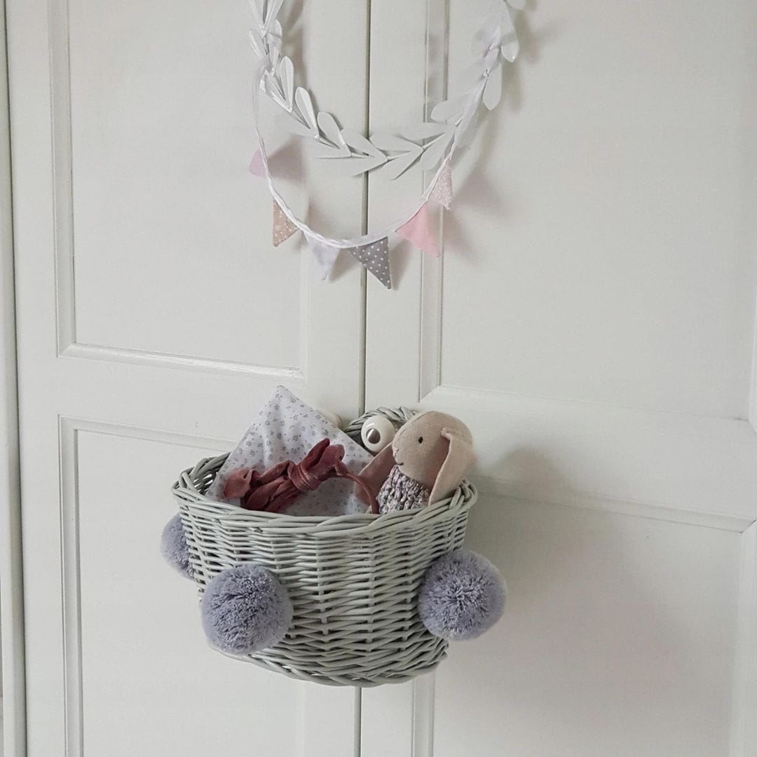 A beautiful wall basket for toys, books and other children's trinkets. There are three gray pom poms attached to the basket, which you can untie and attach elsewhere.