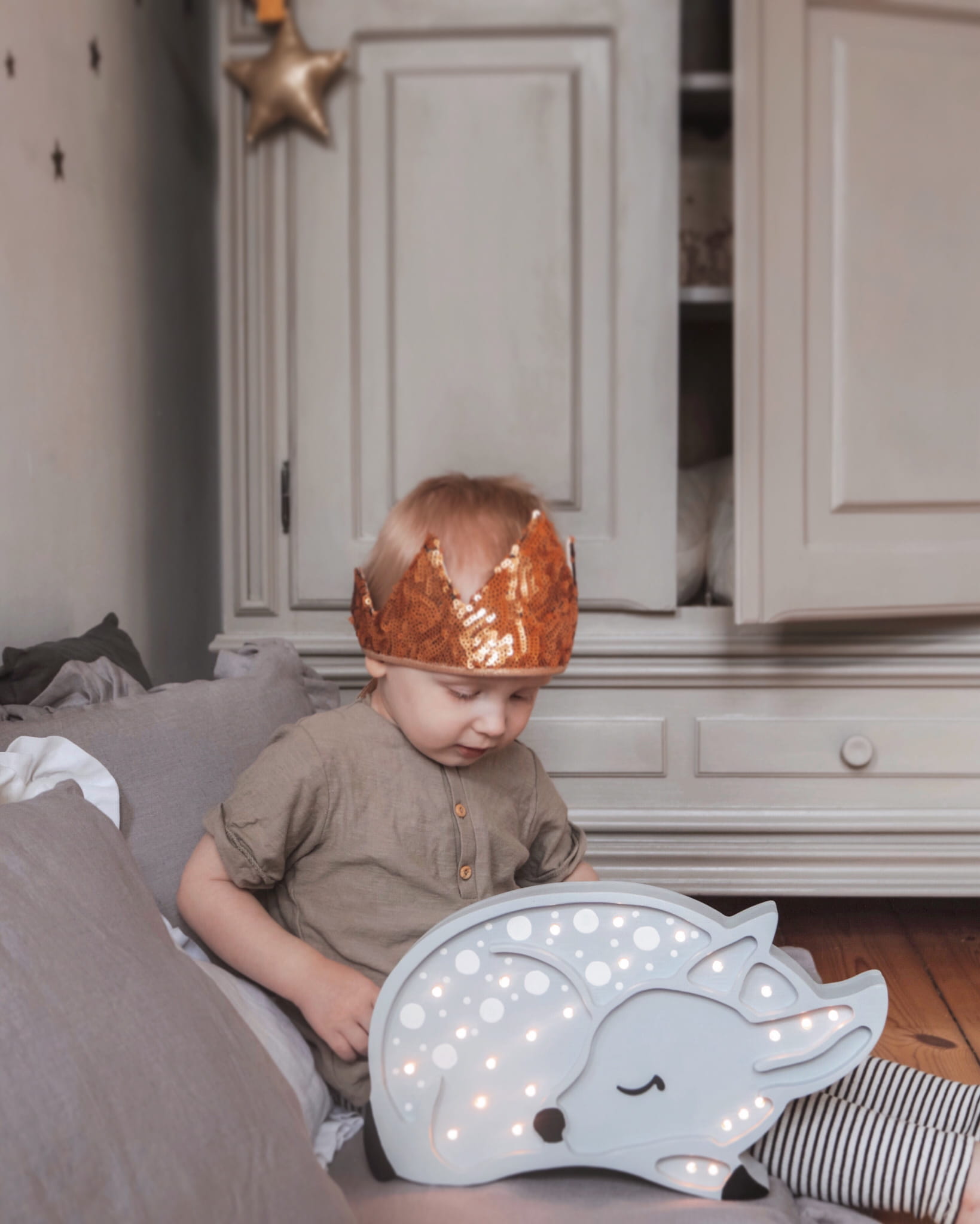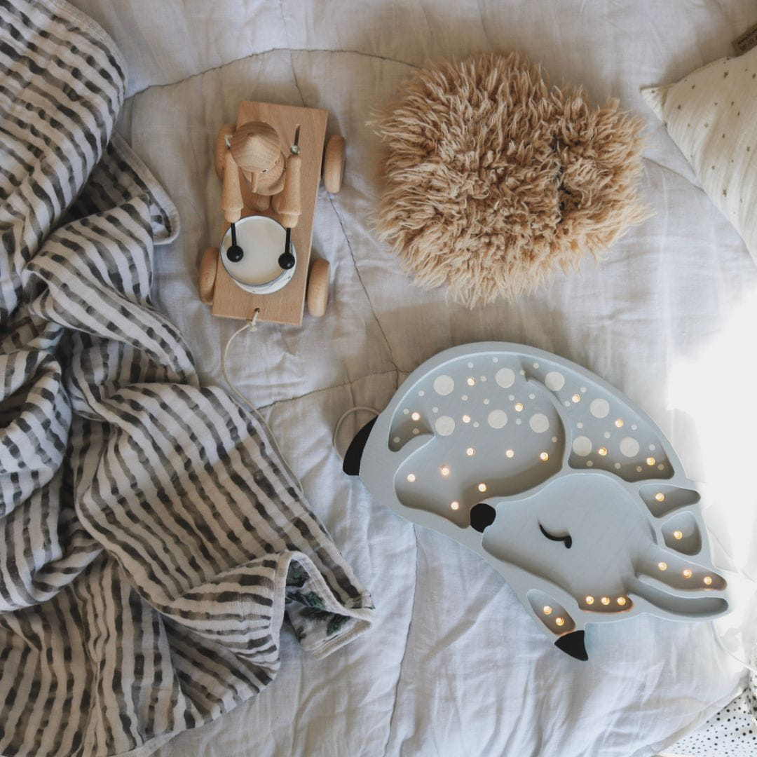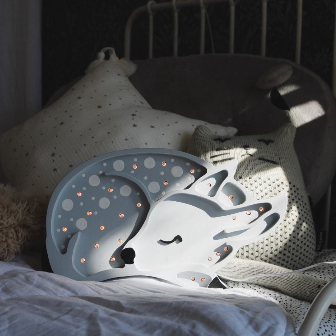 Wooden Little Lights lamp in the shape of a deer. This cute little deer will light up your little one's imagination and add an atmosphere of nature, parks, and outdoor play to room decor. This wooden lamp will not only illuminate the room, but will also be forest room decor.