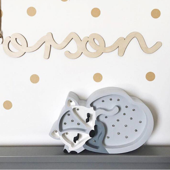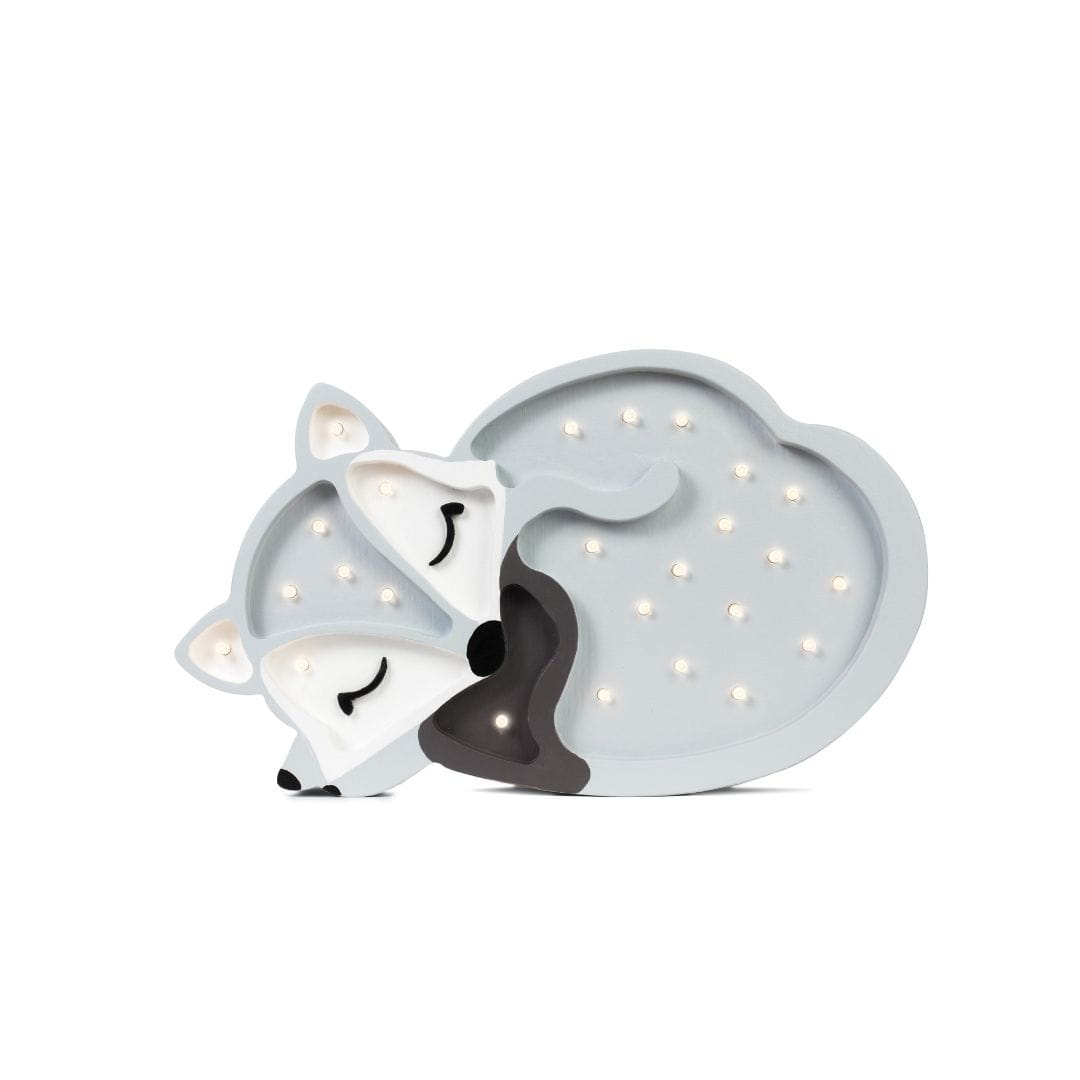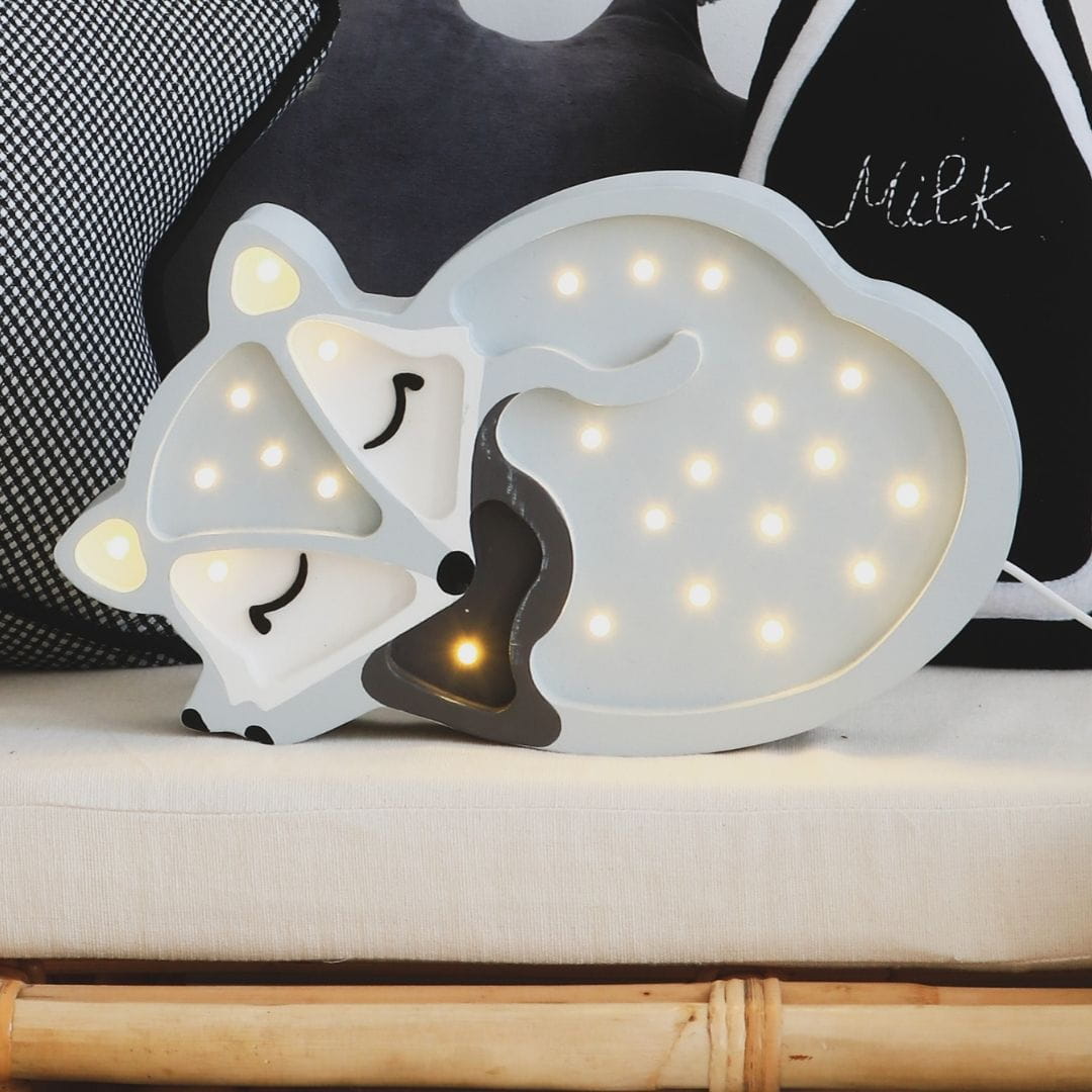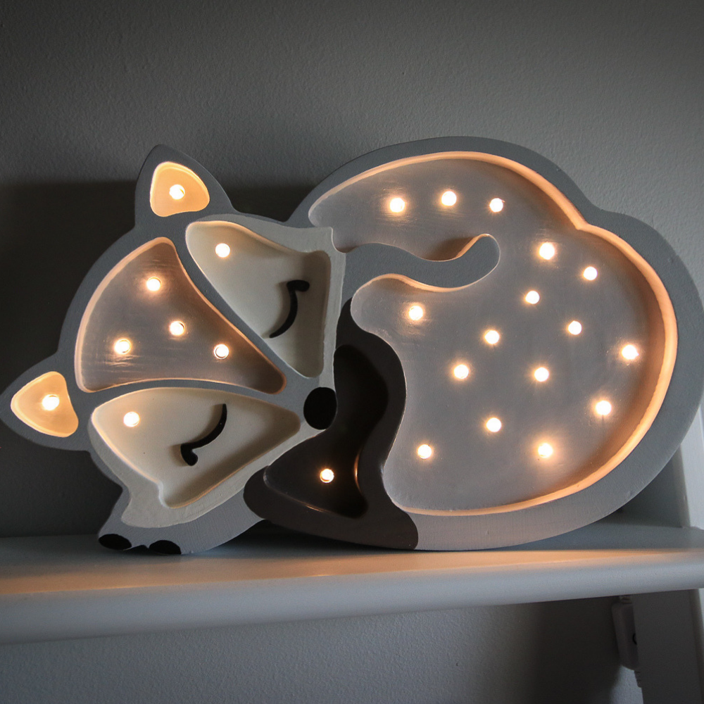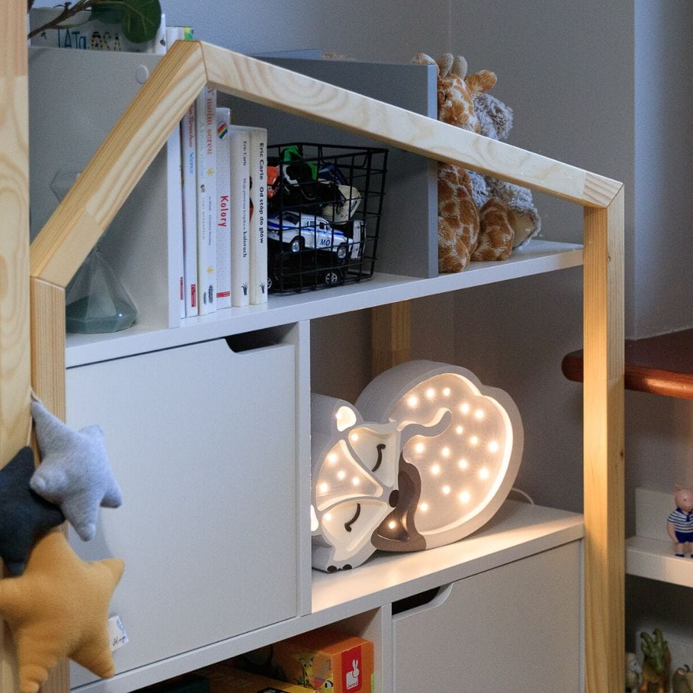 Wooden Little Lights lamp in the shape of a sleeping fox. The lamp, which will turn into a fluffy friend sleeping next to the bed, will encourage every child to fall asleep in his room.