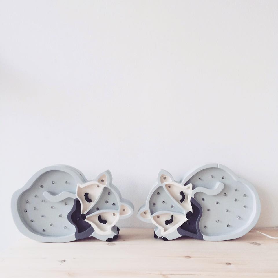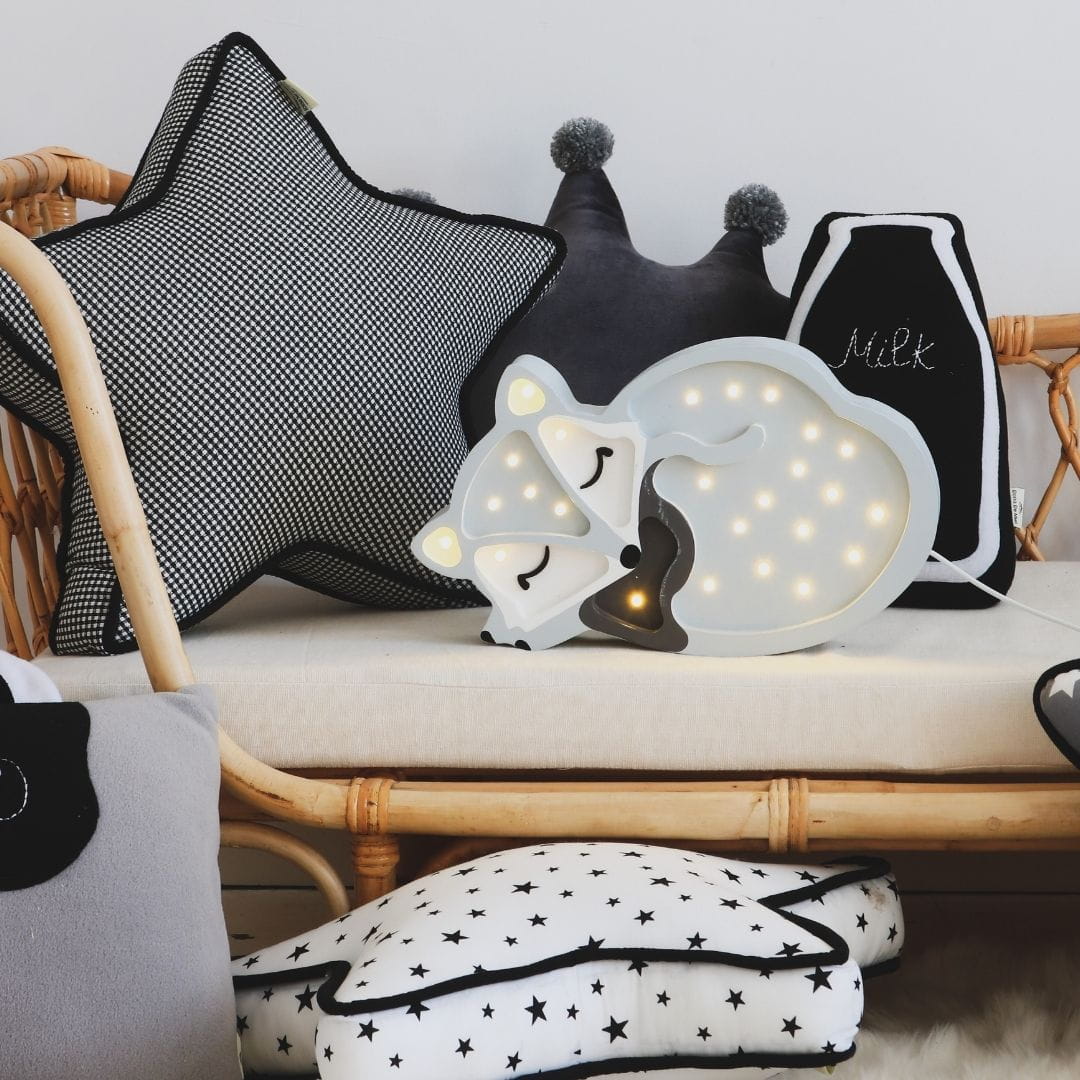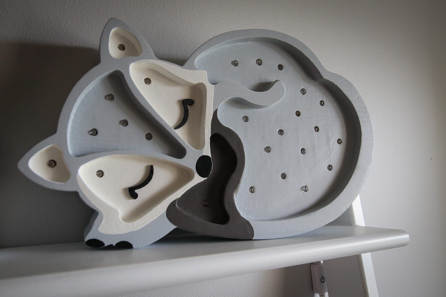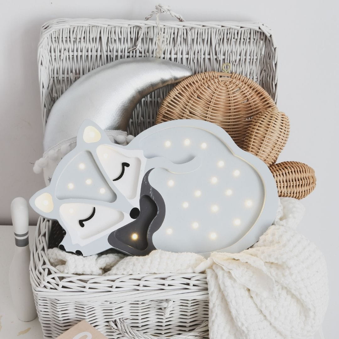 Wooden Little Lights lamp in the shape of a sleeping fox. The lamp, which will turn into a fluffy friend sleeping next to the bed, will encourage every child to fall asleep in his room.