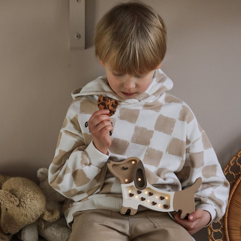Wooden Little Lights lamp in the shape of a puppy. This wooden lamp will not only illuminate the room, but will also be an interesting room decor.