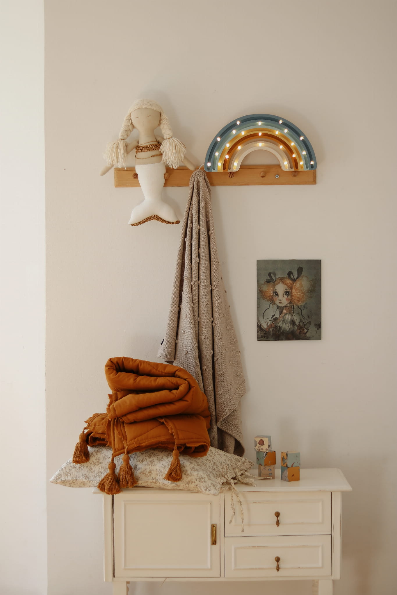This high-quality children's night light is handmade from 100% natural pinewood, making it as strong and durable as it is beautiful. Little Lights rainbow lamp can be hung on the wall.
