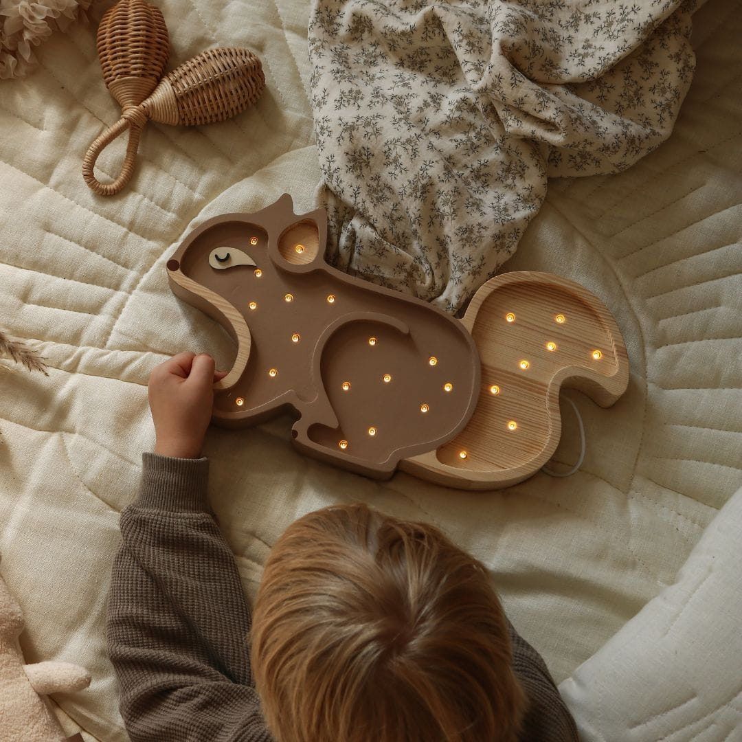 Wooden Little Lights lamp in the shape of a squirrel. This cute little squirrel will light up your little one's imagination and add an atmosphere of nature, parks, and outdoor play to room decor. This wooden lamp will not only illuminate the room, but will also be forest room decor.