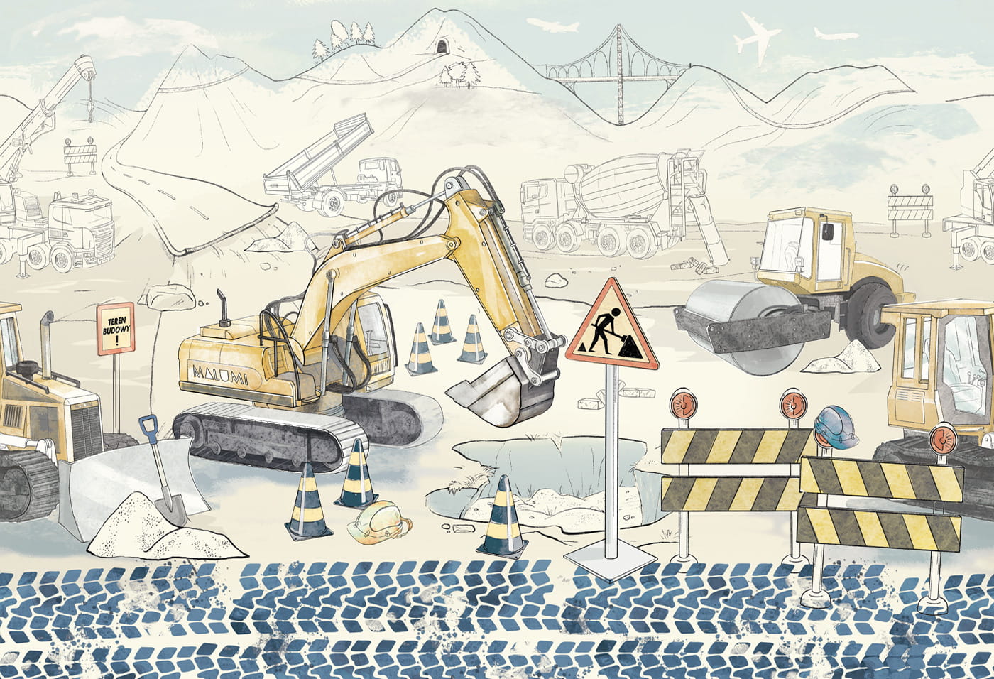 A wallpaper for a boy's room with a construction site is a great solution for any fan of construction machines. The mural shows a scene with a roller, excavator, tipper and other vehicles, as well as warning signs. Create an original scenery that stimulates your child's imagination.
