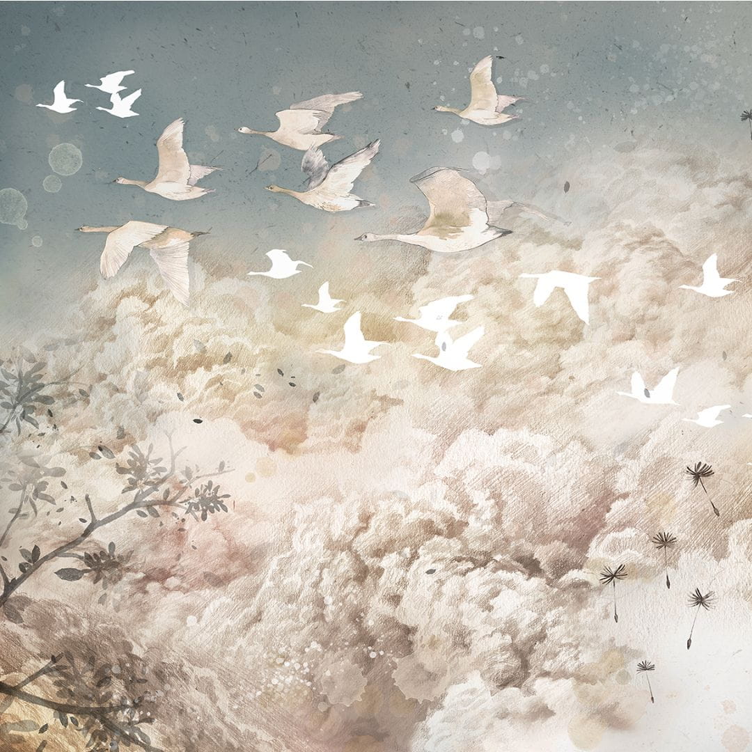 Original wallpaper for a child's room is made of magic clouds and birds in neutral, calm colors. This wallpaper for girls will look beautiful with wooden, whte or wicker furniture.