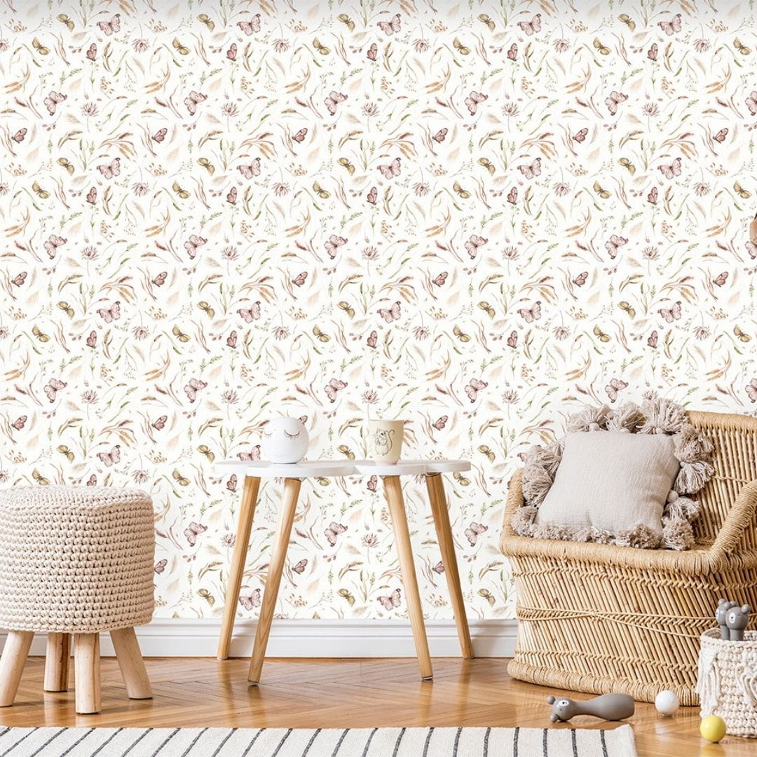 Beautiful, bright wallpaper with a delicate pattern, perfect for a girl. Butterflies, grasses, ears and flowers are a wonderful composition that will work well in the room of an infant, preschooler and older girl.