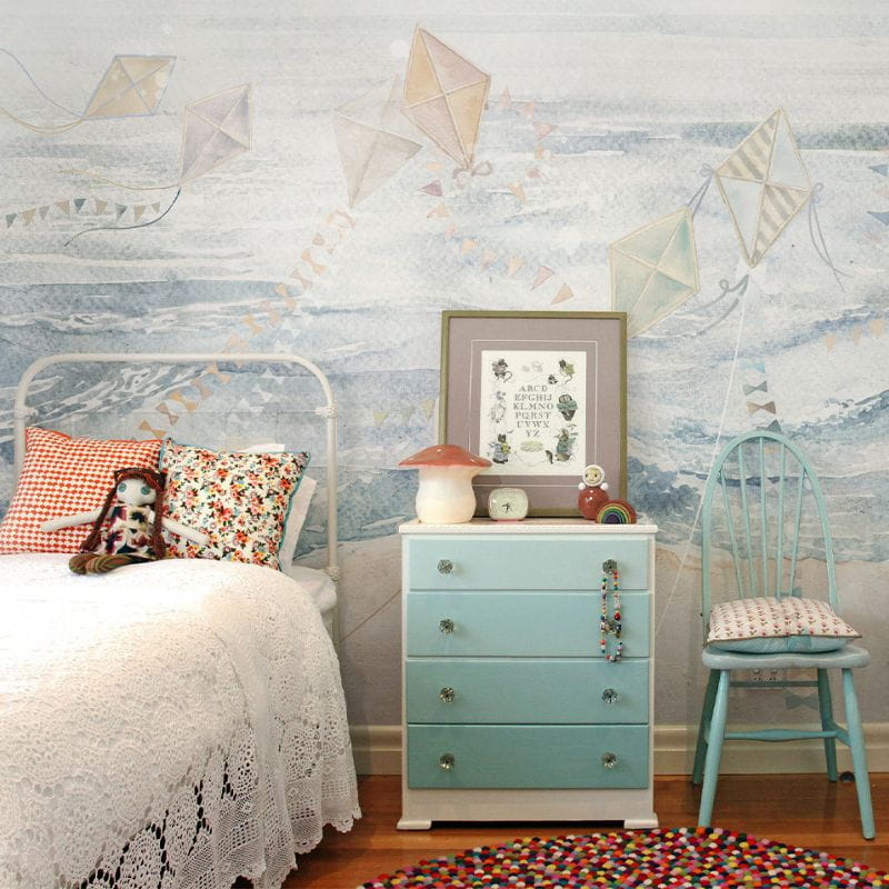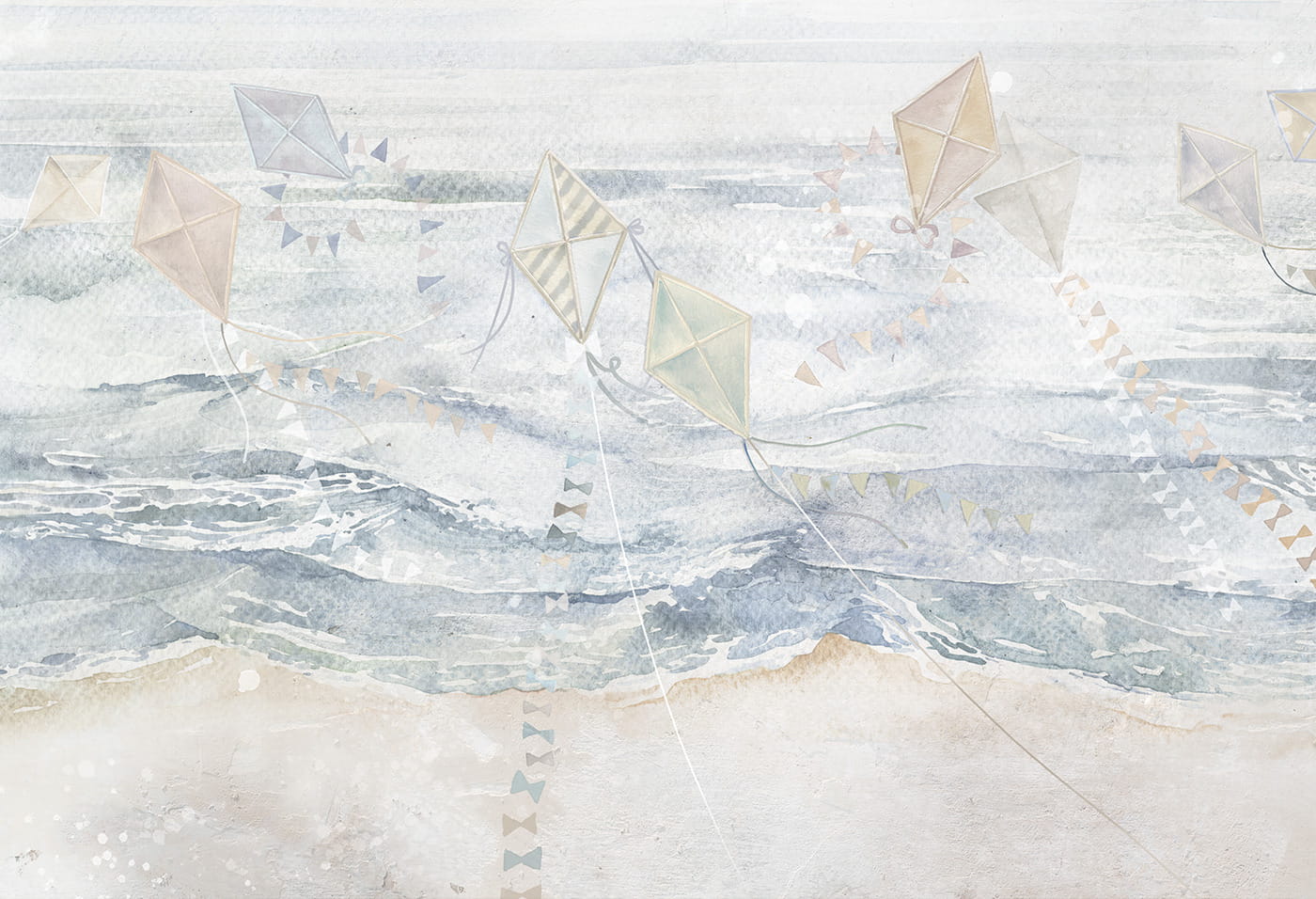 Holiday wallpaper with kites, reminiscent of carefree moments. Children's wallpaper in pastel shades will give the interior lightness and introduce a calm atmosphere.