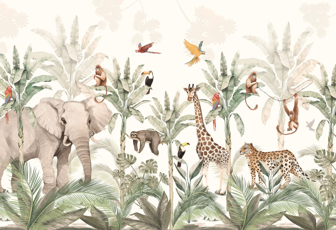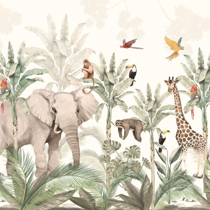 The beautiful, tropical pattern of the Jungle children's room wallpaper is a scene painted with watercolor paints and then printed according to the dimensions of your wall.