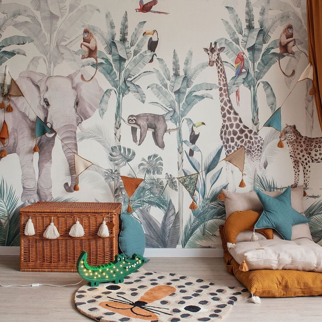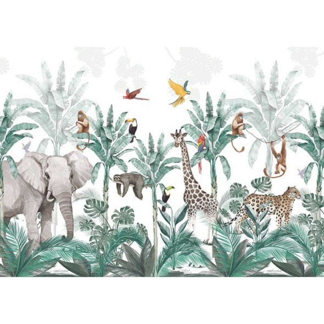 Jungle wallpaper will create a substitute for the jungle in your child's room. The wallpaper includes the wild animals loved by all children: giraffe, elephant, jaguar, parrots surrounded by a tropical green forest.