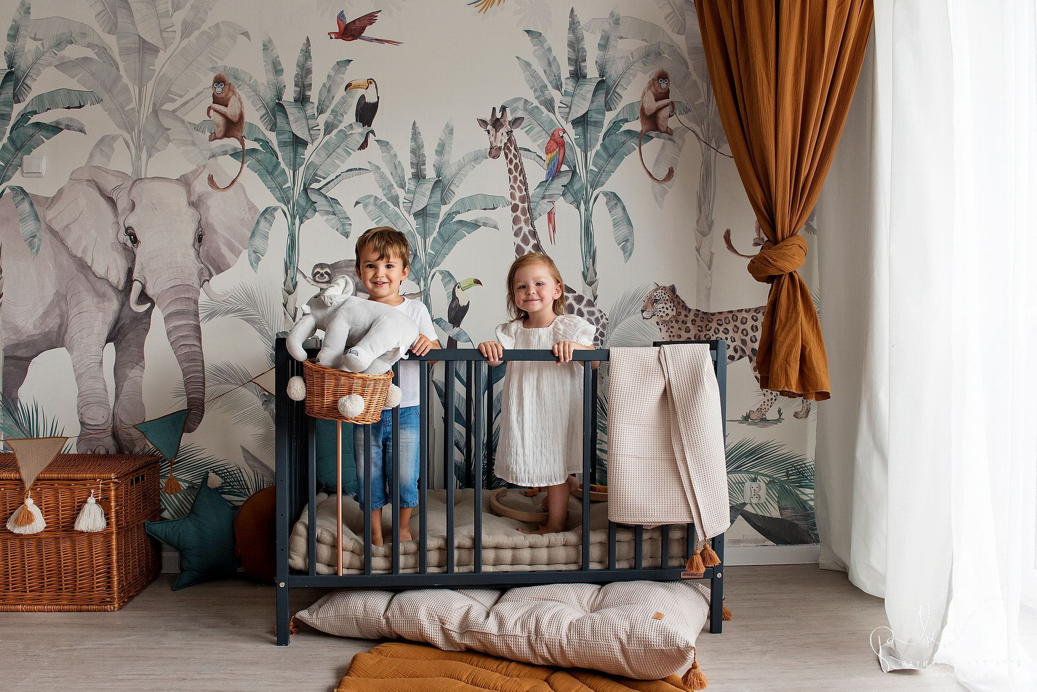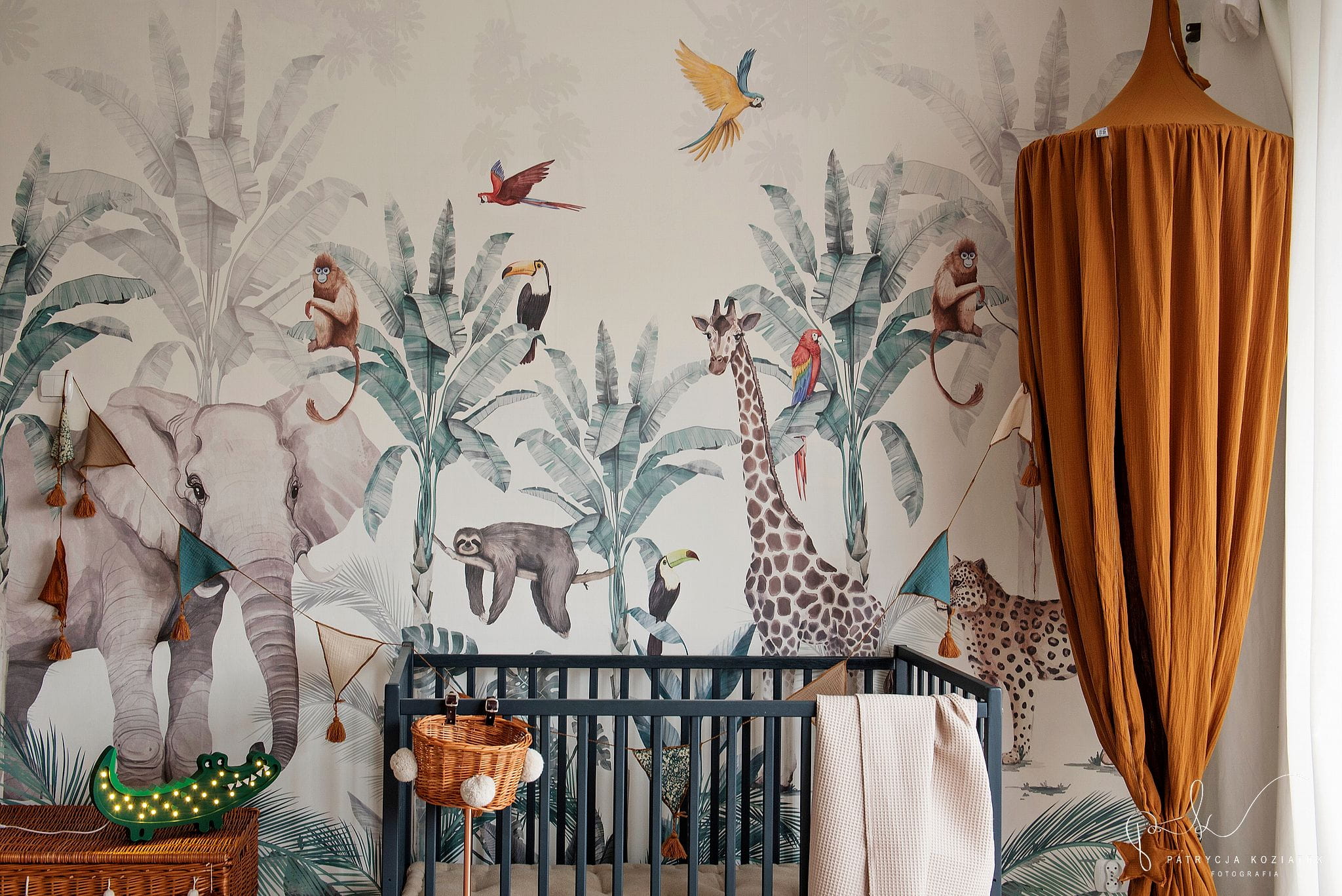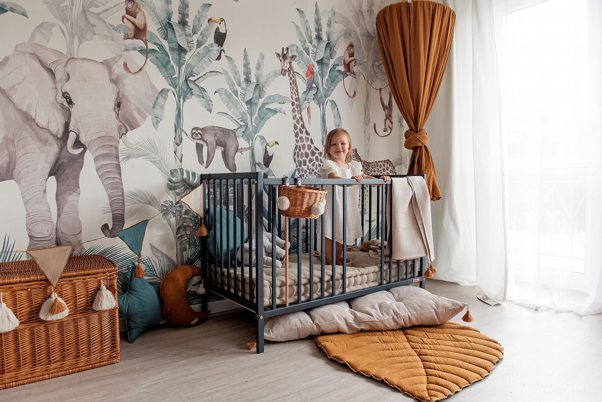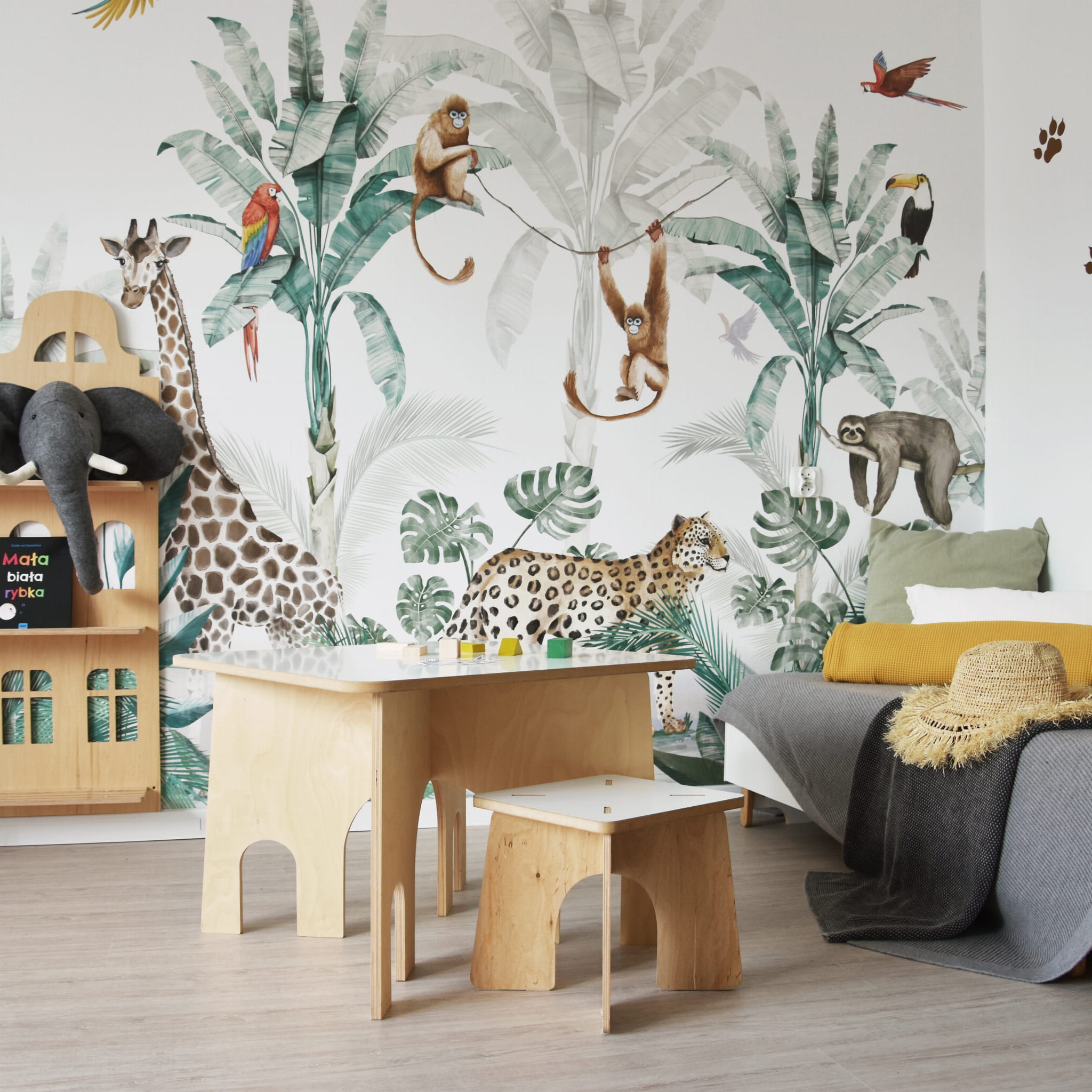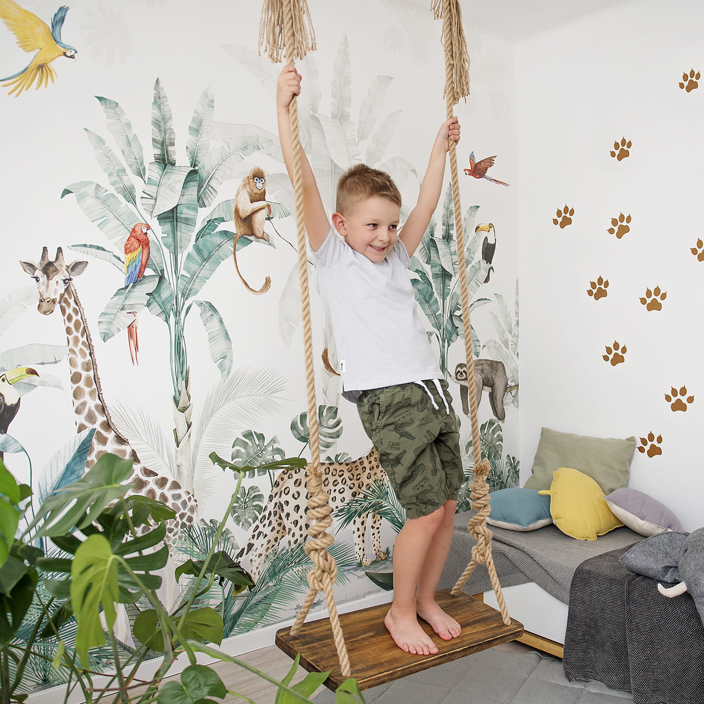 The safari wallpaper will stimulate the child's imagination and give the interior a unique character. It is a perfect scenery for an active child's room. If you plan to install a child in a monkey grove room, a ladder, a rope or a swing, the Jungle children's wallpaper will emphasize the atmosphere and encourage to play. Your child will have a chance to play straight from the The Jungle Book, Jumanji and other stories that take place in wild and exotic areas.