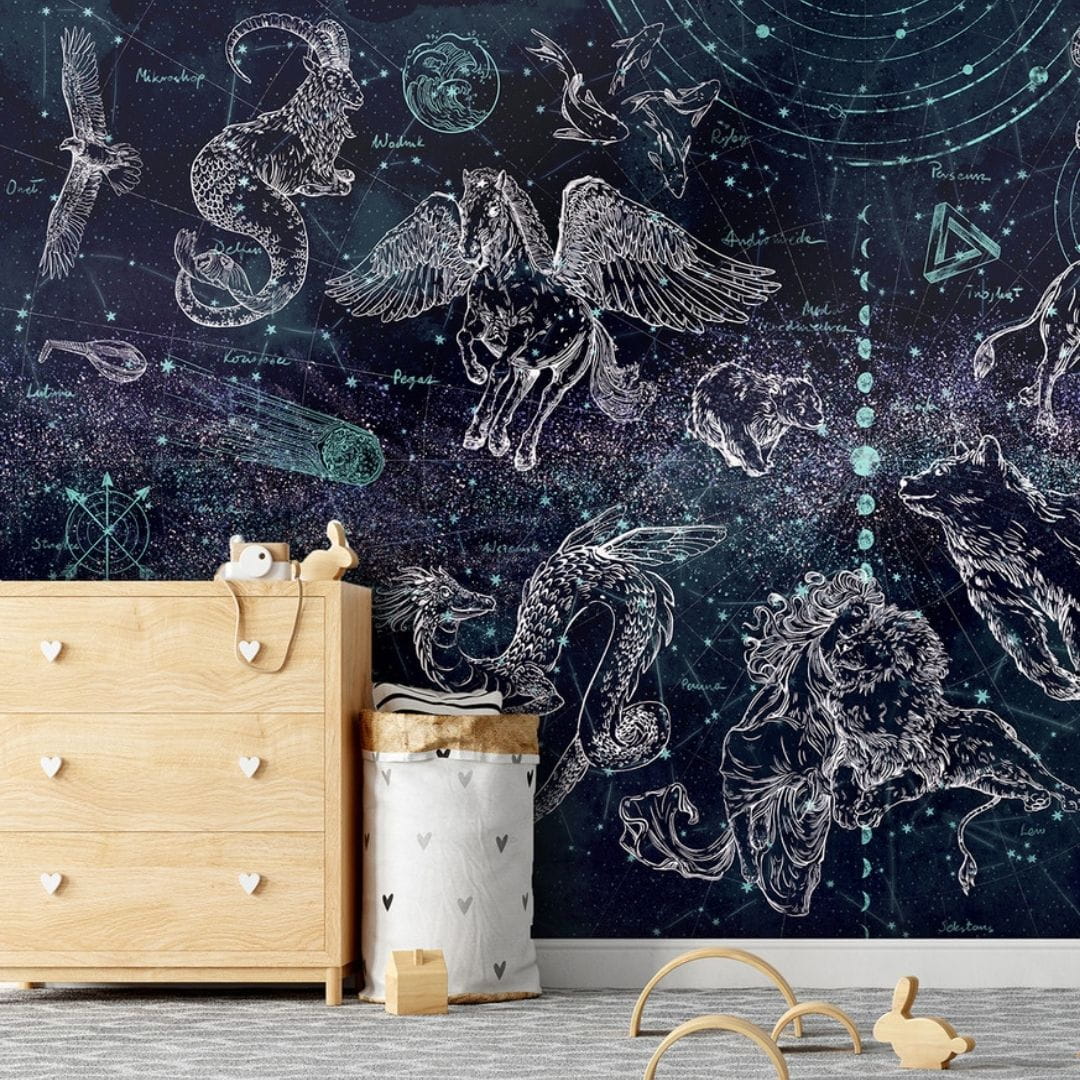 Are you looking for inspiration for a space boy's room? We have the perfect solution for you! The space fan's room wallpaper is a beautifully painted night sky with zodiac signs.