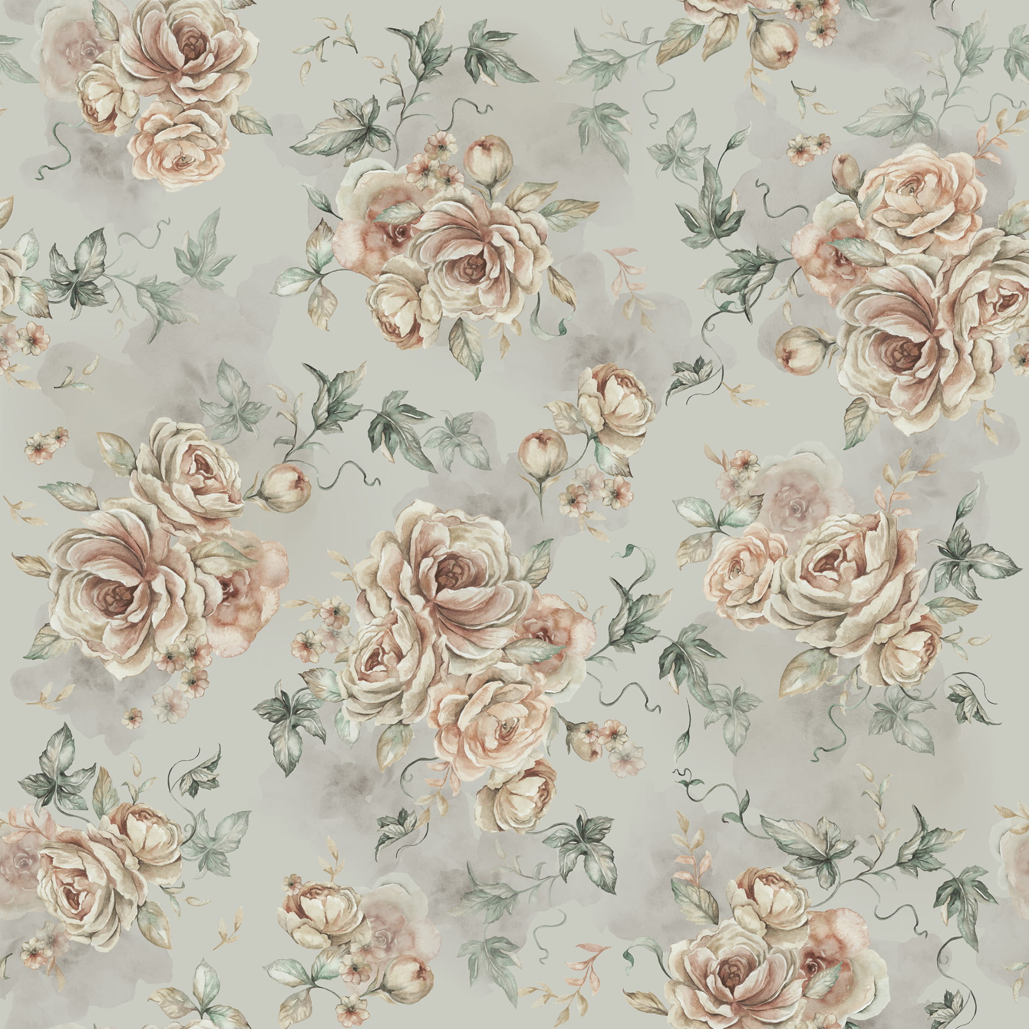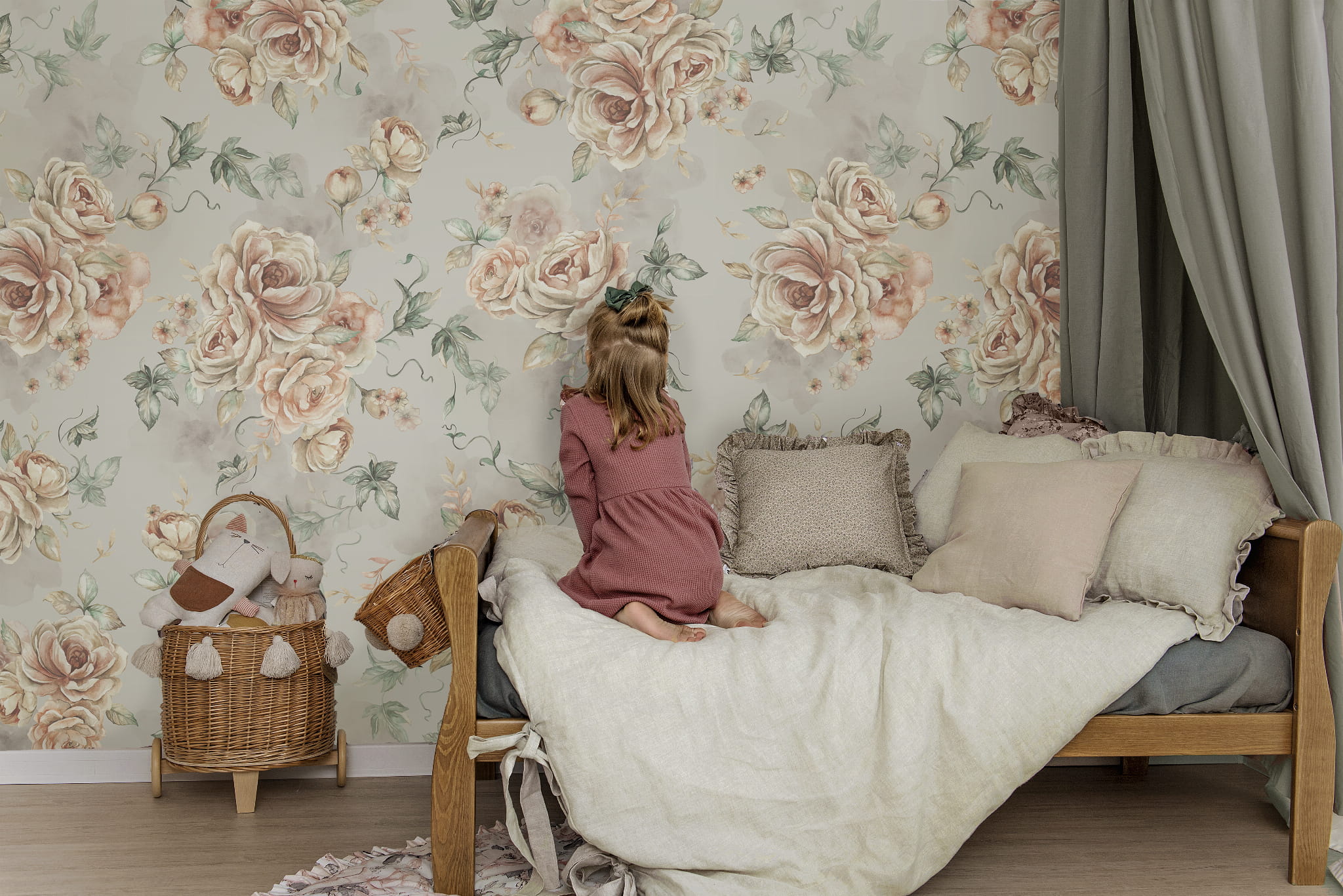 A wallpaper for a girl's room with beautiful painted roses and leaves. The space between the flowers is filled with the most fashionable gray background. The pattern is liked by small and adolescent girls.