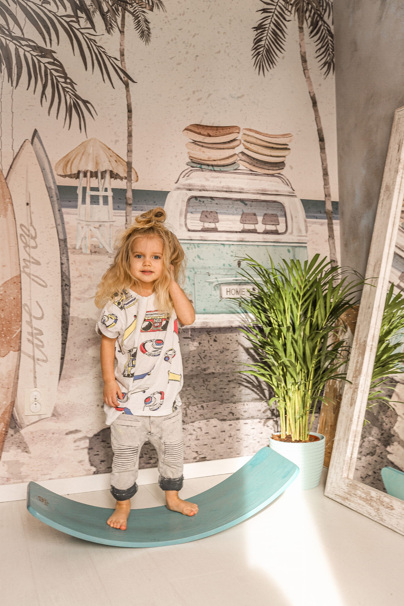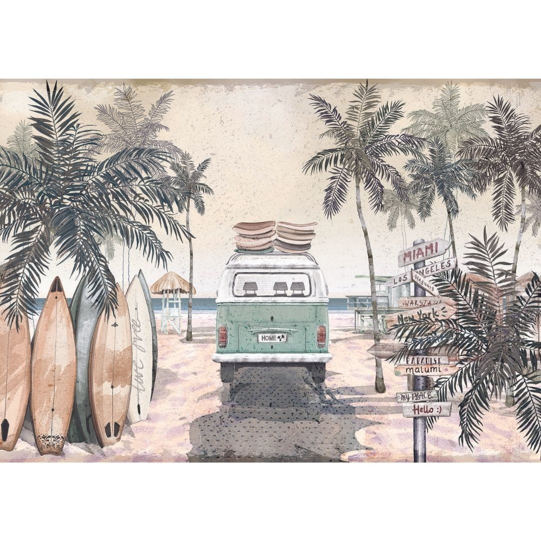 The amazing Summer Vibes wallpaper for children will bring back the best holiday memories! Retro van and surfboards surrounded by palm trees and the background of the ocean are a design that will work both in a boy's and girl's room.