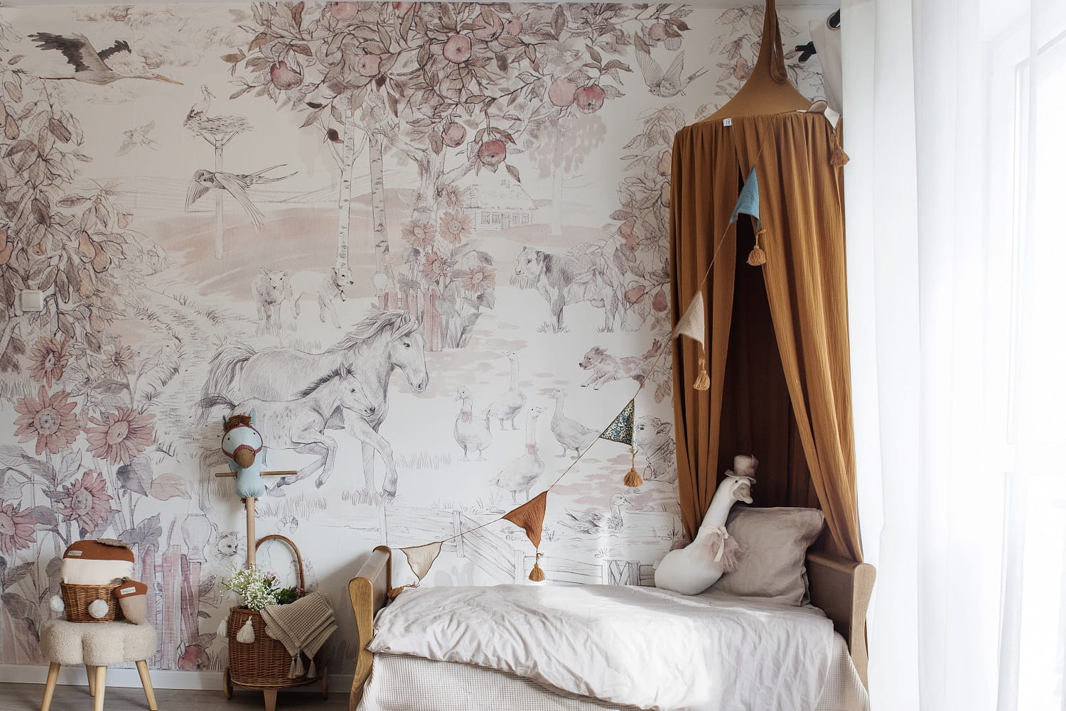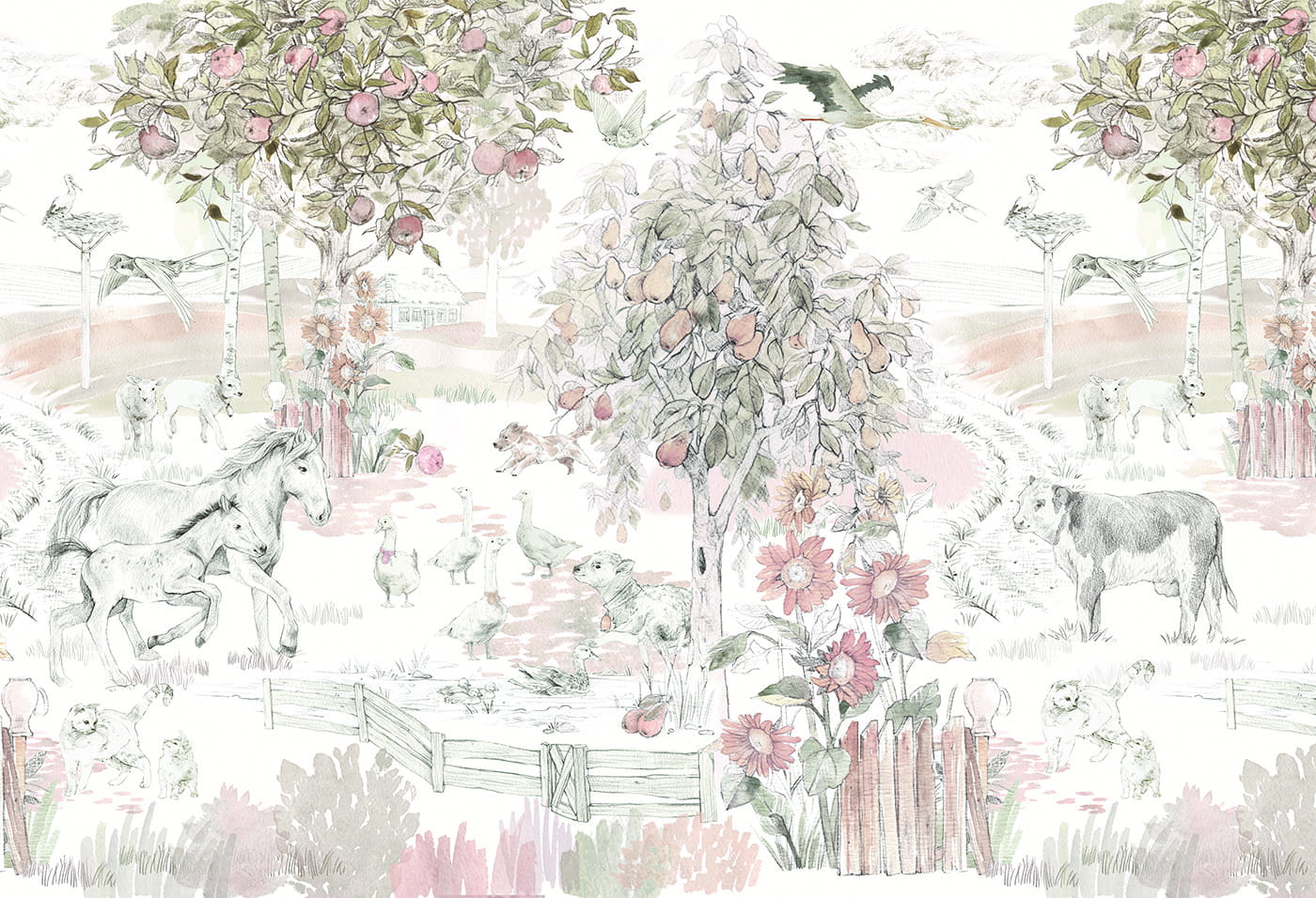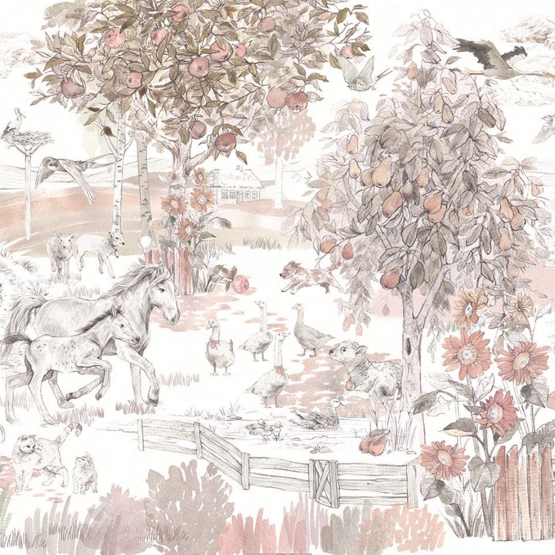 Original wallpaper for a child's room is an idyllic scene of village life. The animals surrounded by a fruit orchard will delight every child. Beautifully selected colors on the children's wallpaper will create a unique atmosphere in a kid's room.