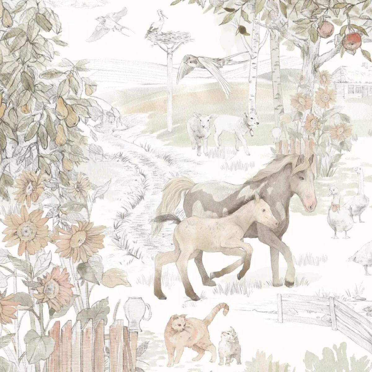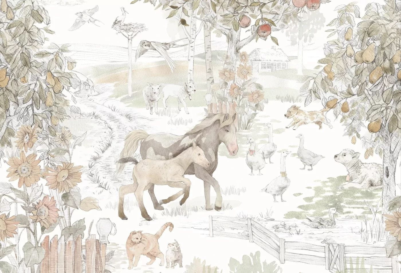 Original wallpaper for a child's room is an idyllic scene depicting rural life. Horses, cats, geese, storks surrounded by a fruit orchard will delight every child. Beautifully selected colors on the children's wallpaper will create a unique atmosphere in a toddler's room.