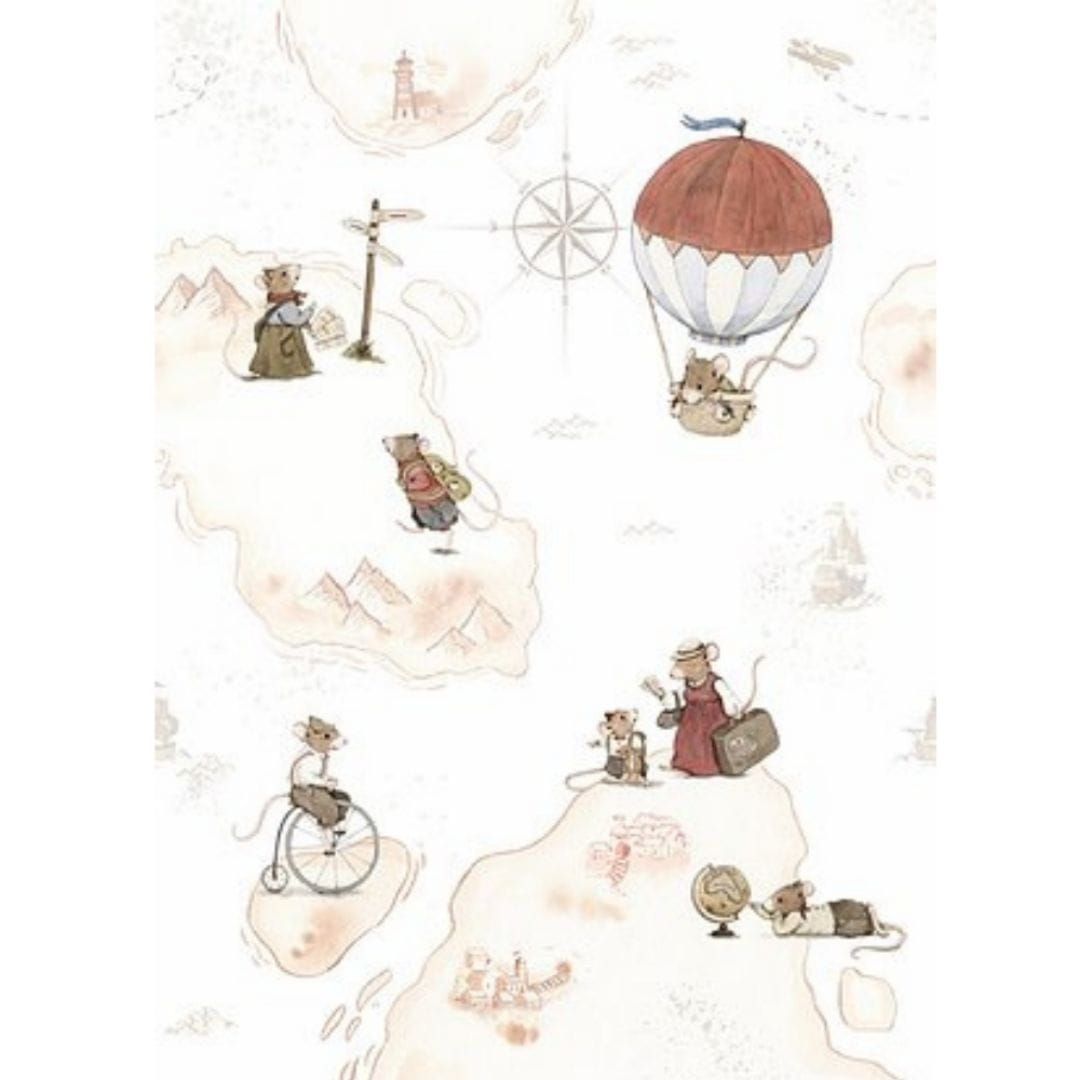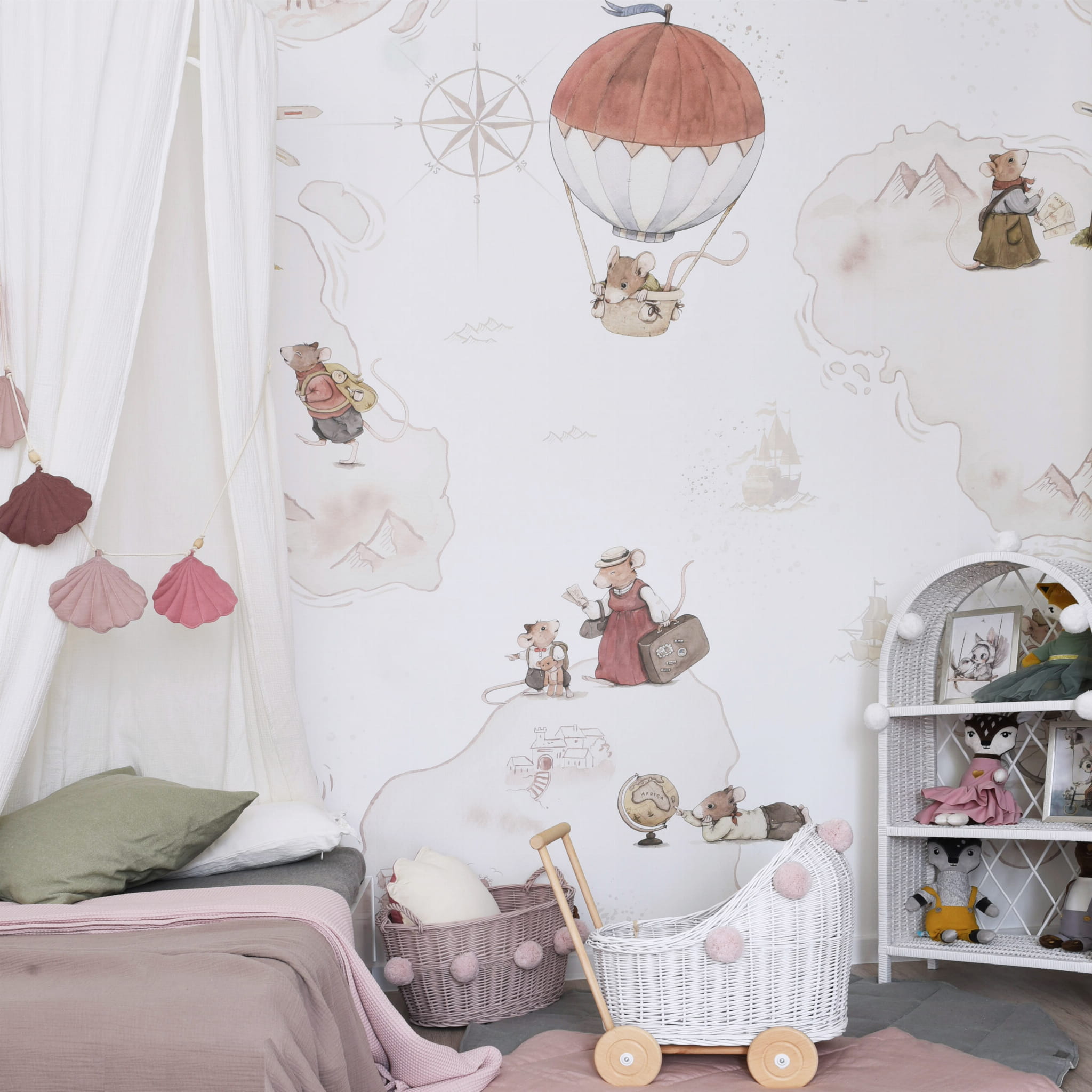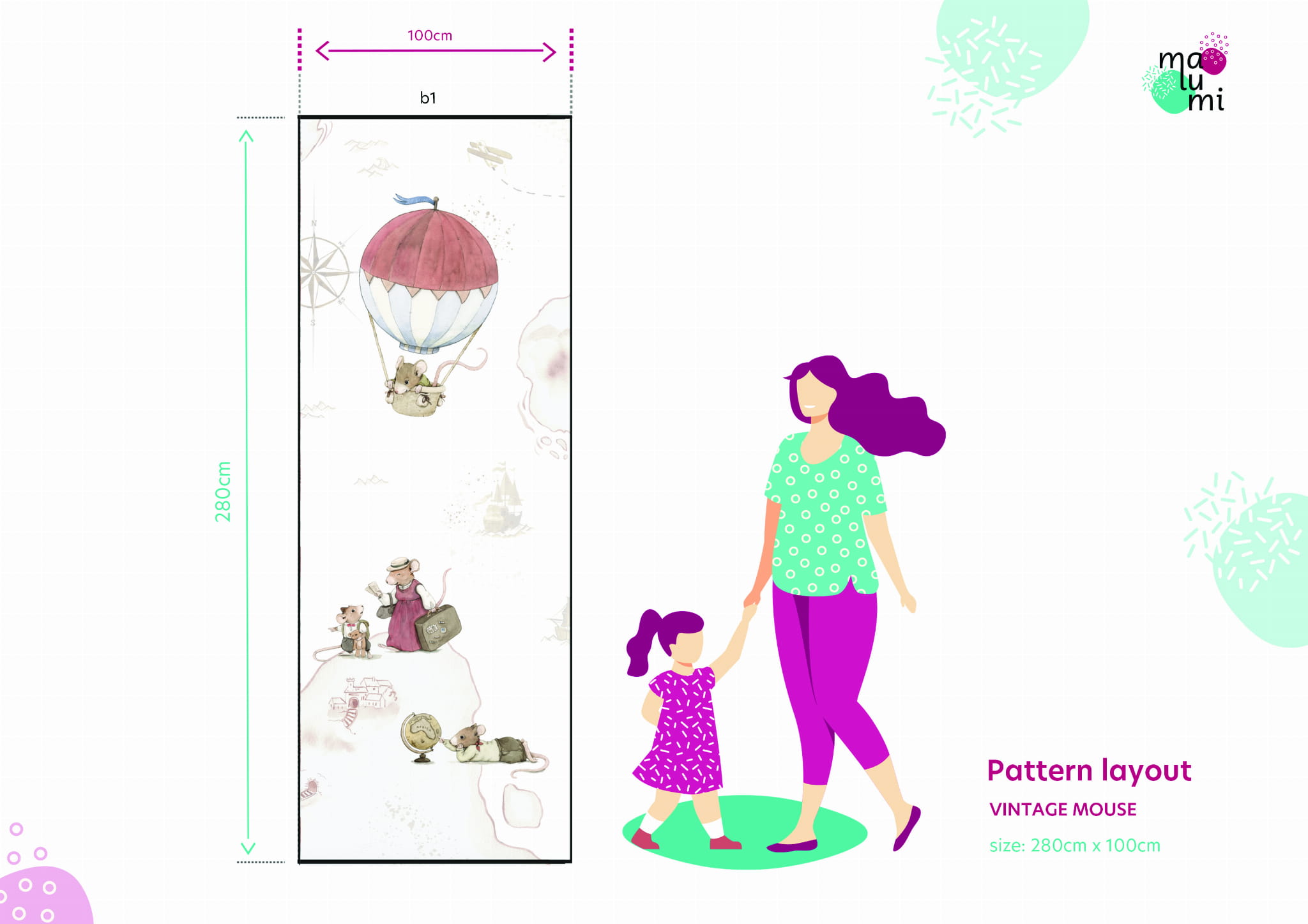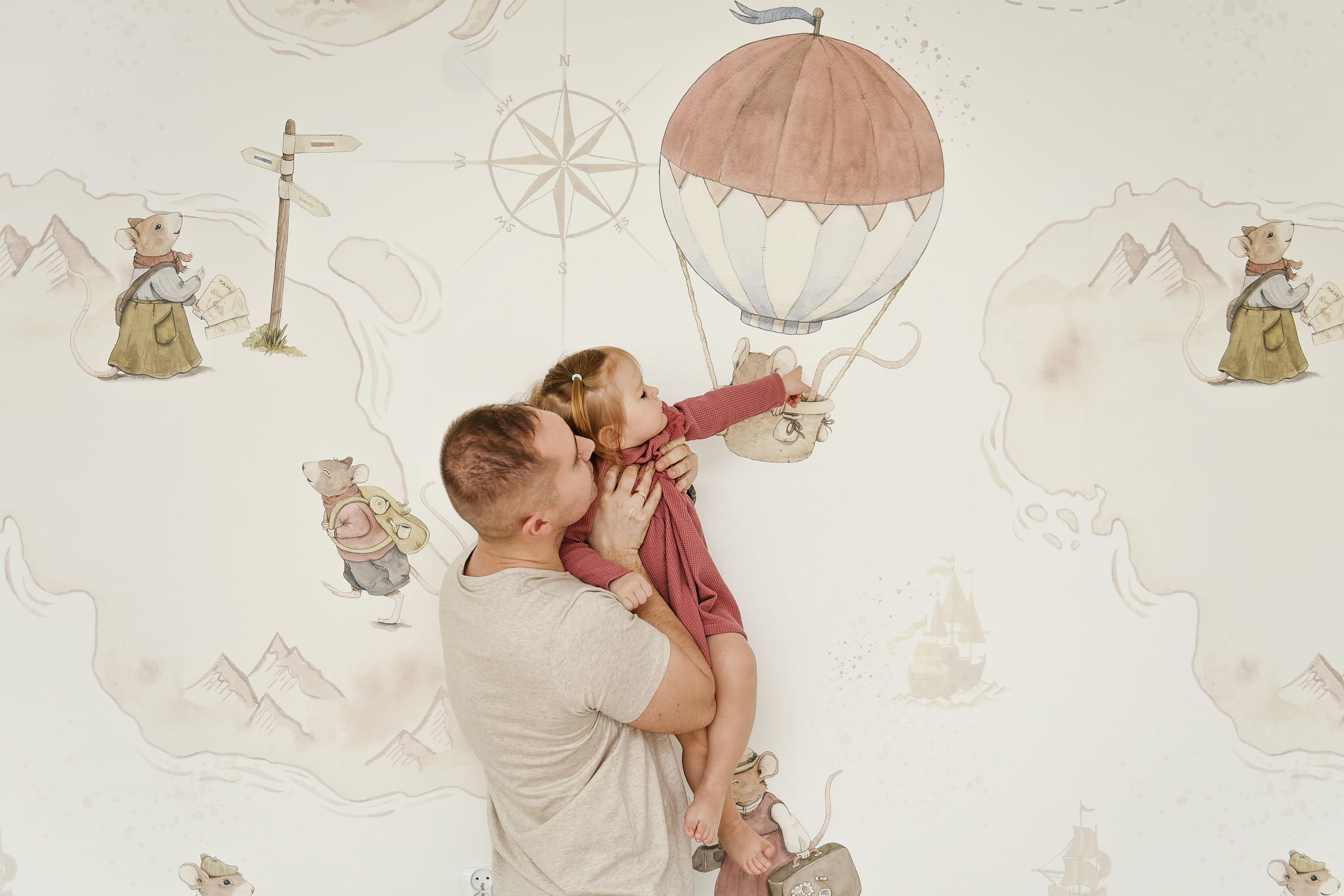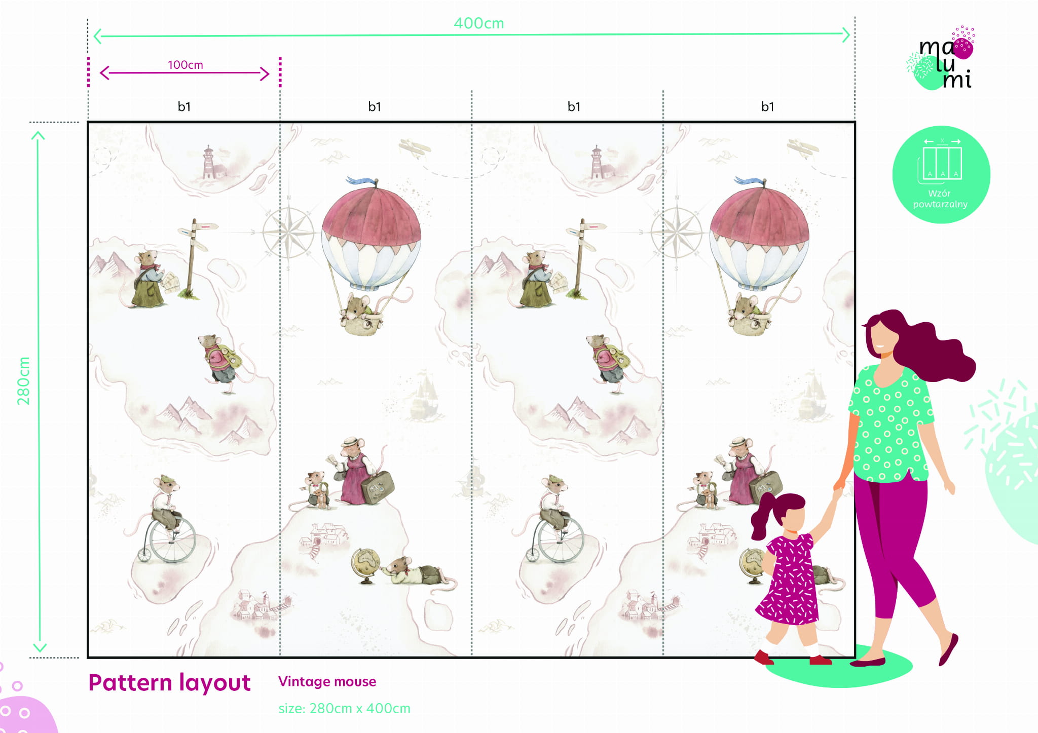 In the Vintage Mouse Malumi series you will find children's wallpapers with mice painted with watercolors in a range of retro colors. In this pattern of wallpaper, mice travel in different ways and in different directions. One of the rodents flies a balloon and controls the flight altitude. Madame mouse makes sure which path to take. There is also a cyclist and a mouse youth with a backpack. Mom and her children talk about a trip to Paris, because they have tickets for it.
