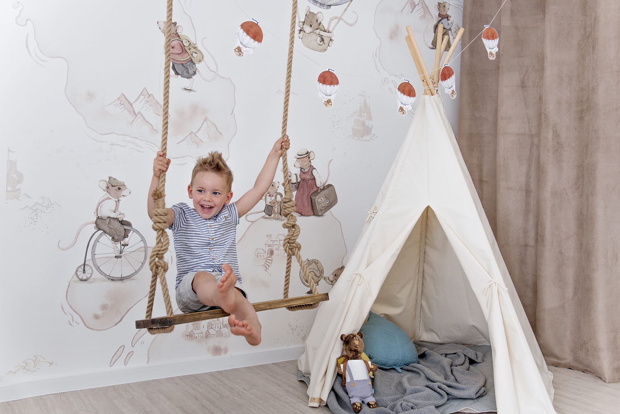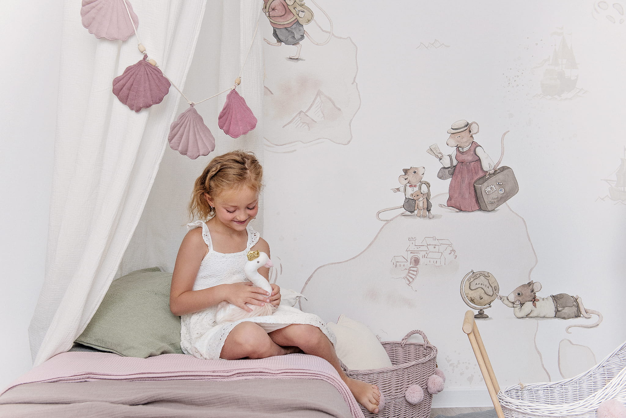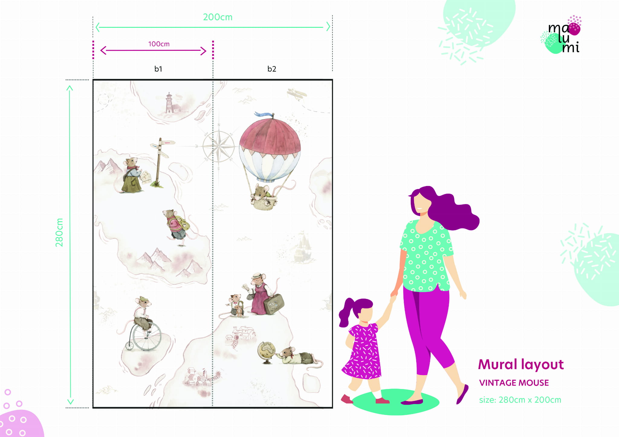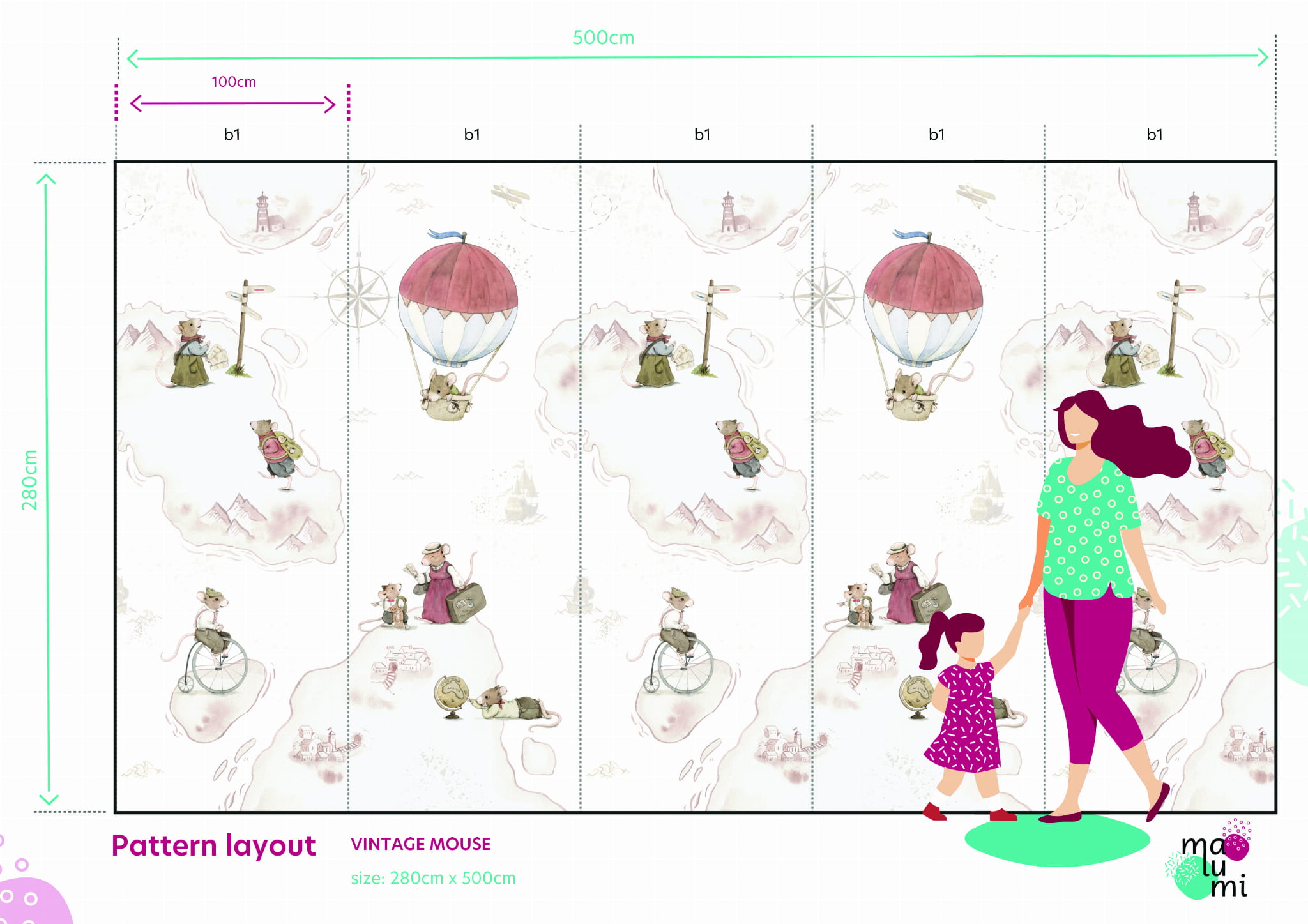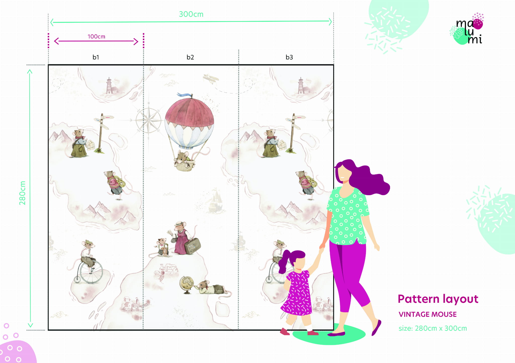 In the Vintage Mouse Malumi series you will find children's wallpapers with mice painted with watercolors in a range of retro colors. In this pattern of wallpaper, mice travel in different ways and in different directions. One of the rodents flies a balloon and controls the flight altitude. Madame mouse makes sure which path to take. There is also a cyclist and a mouse youth with a backpack. Mom and her children talk about a trip to Paris, because they have tickets for it.