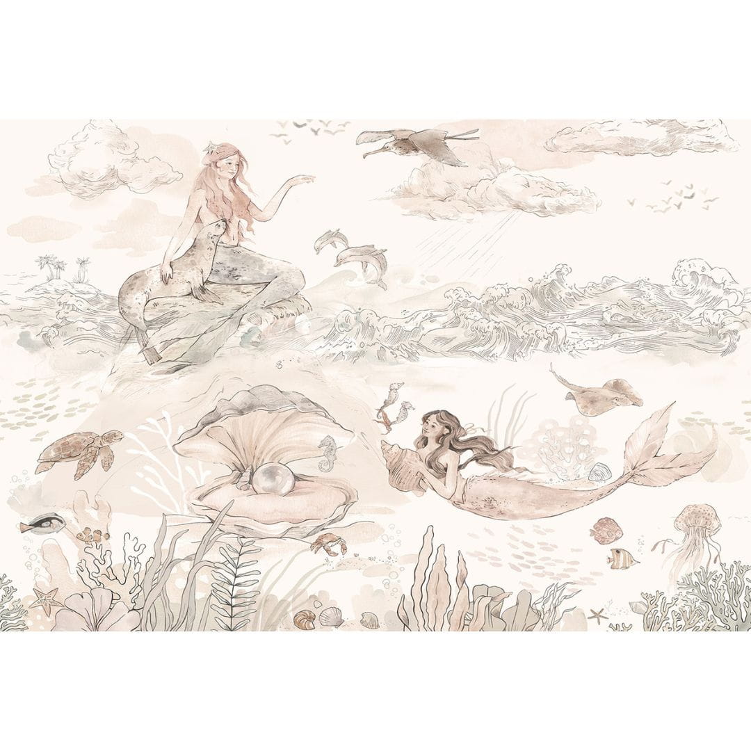 In a child's room, together with the mermaid wallpaper, the space becomes cozy, filled with soothing colors, allowing for the development of colorful children's fantasies. All lovers of fairy-tale creatures will like the mermaid wallpaper. The pattern shows colorful mermaids, fish, plants and other sea creatures. The whole is in sepia colors.