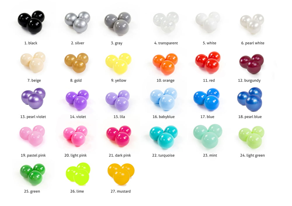 You can choose from as many as 27 ball colors! The balls come in sets of 50 pieces, so you can choose 4 sets of colors. Please specify the colors of the balls in the comment to the order.