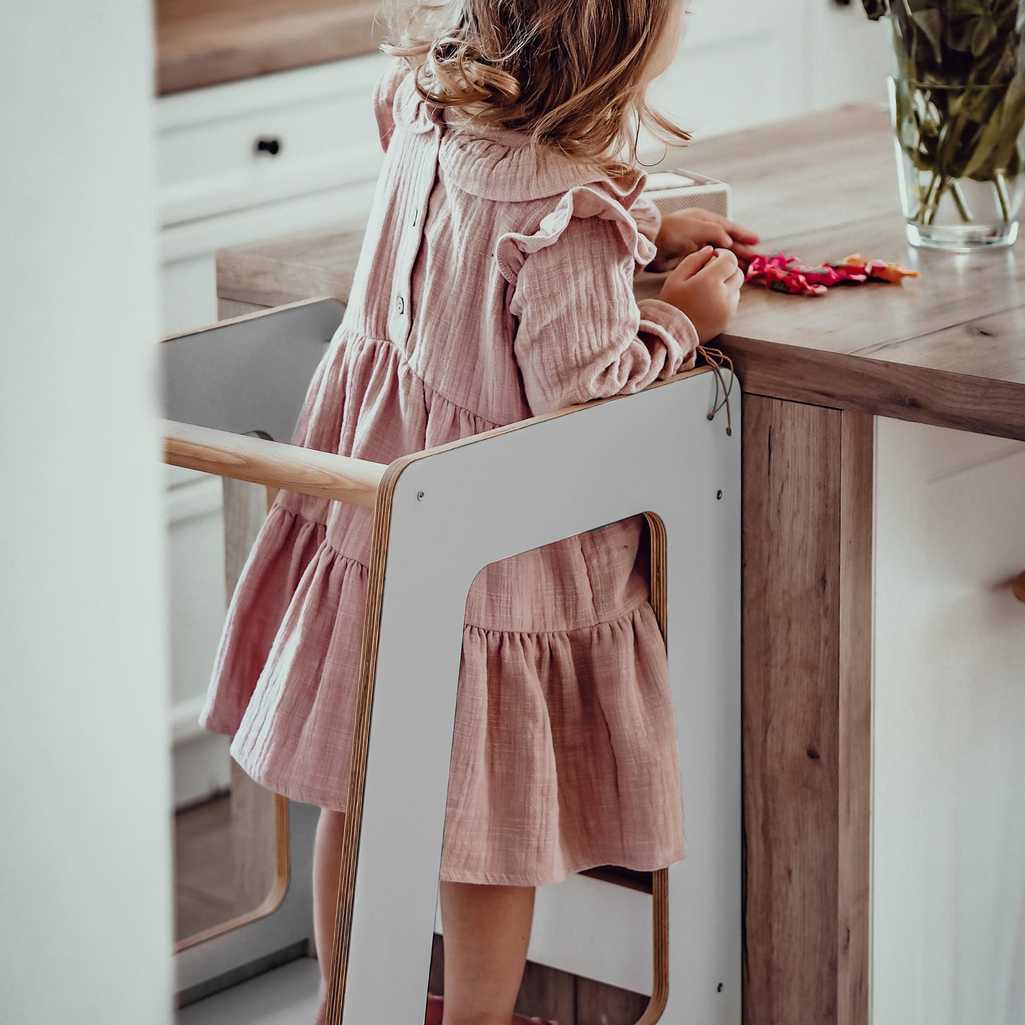 The Kitchen helper provides the child with a world full of interesting experiences. The child, standing on the platform, can learn without any obstacles by observing adults, wash dishes or perform simple kitchen activities. In this way, it can strengthen self-esteem, develop independence and self-confidence, and improve coordination of movements. So if your child loves spending time with you in the kitchen and is willing to help, then the kitchen helper will certainly fulfill its role. Your toddler will participate in family life, and preparing meals will become great fun!