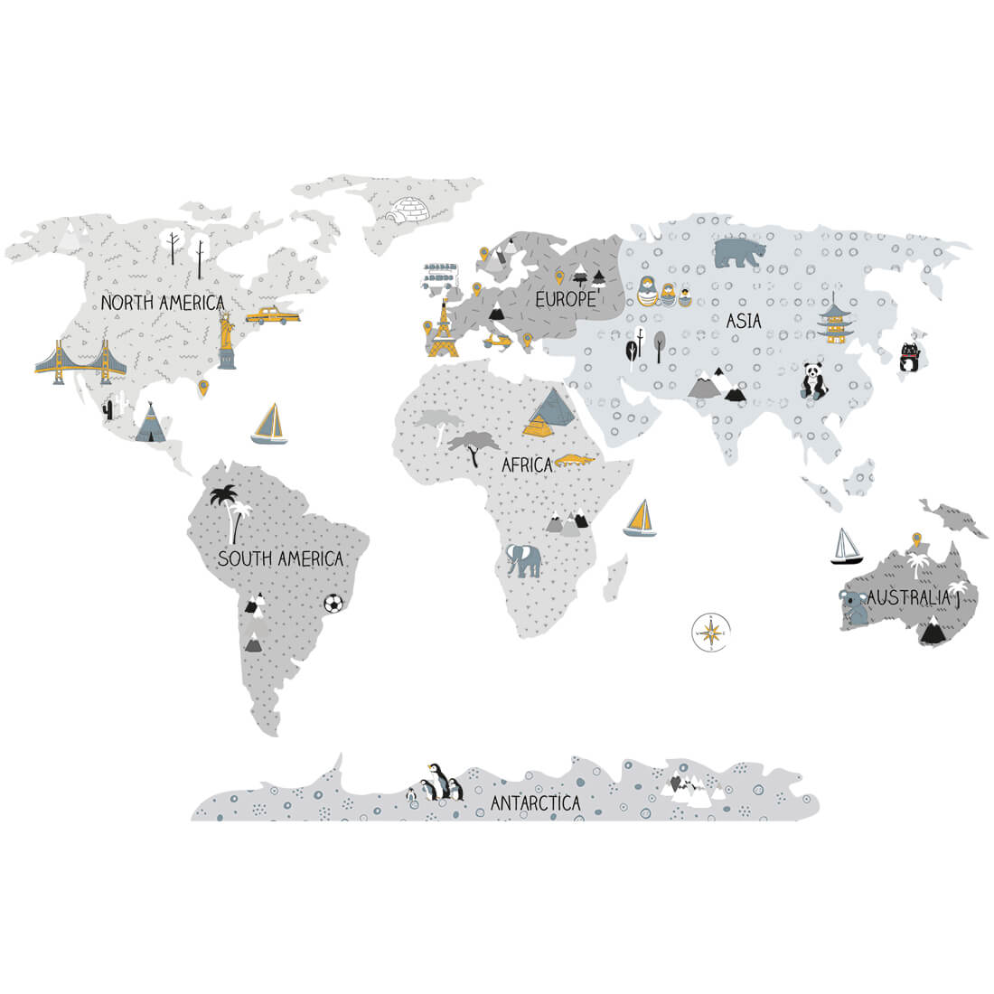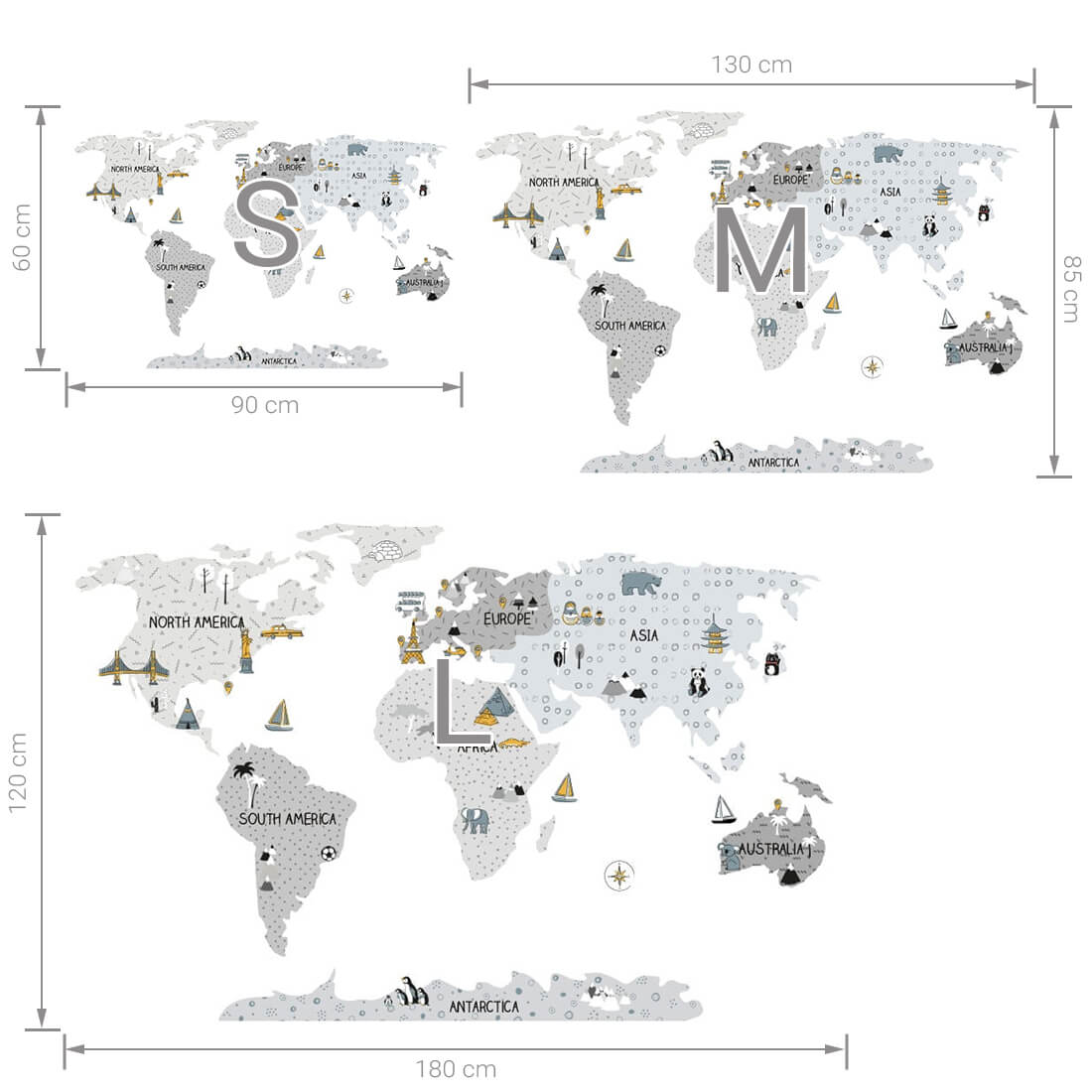 A World Map wall sticker for kids is not only a unique decoration, but also great education! Children learn about the continents, oceans and directions of the world, as well as the most important monuments or attractions of a region or country. Thanks to special additional stickers, children can also mark places that they have already visited or which are characterized by typical monuments or attractions.