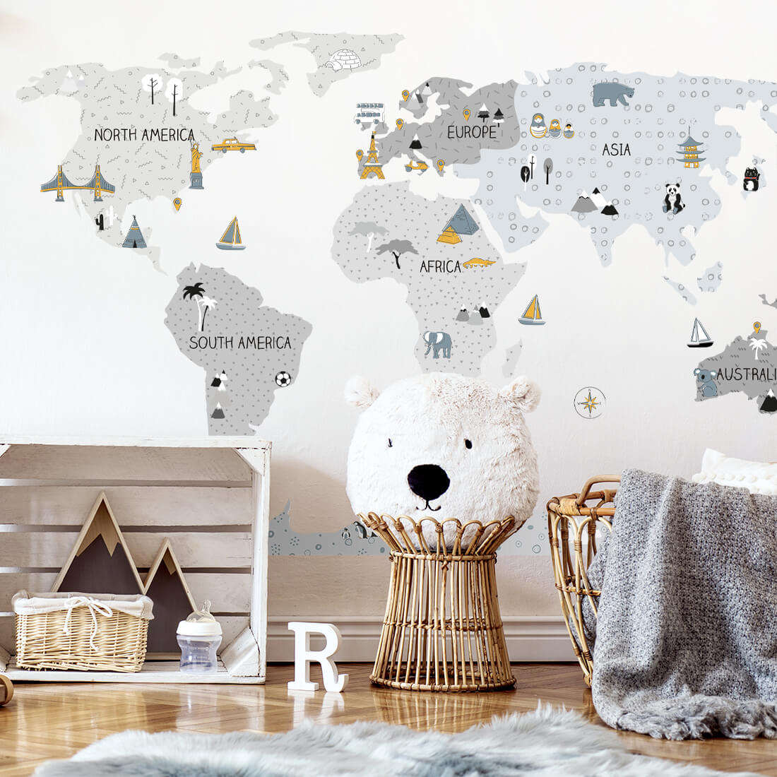 Wall sticker World Maps are products of the highest quality, made with the utmost care and attention to details, maintained in subdued Scandinavian colors that perfectly blend into the child’s space.